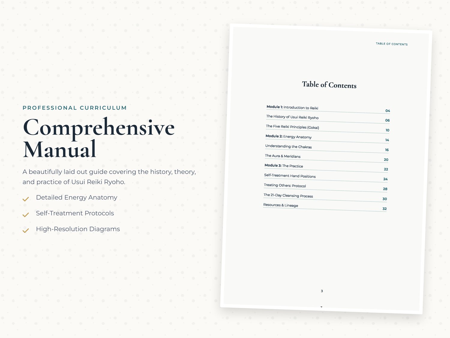 This is not just a manual; it is a complete ecosystem of professional tools designed with a modern, calming aesthetic (Sage, Teal & Gold) that honors the sacred lineage of Usui Reiki Ryoho.