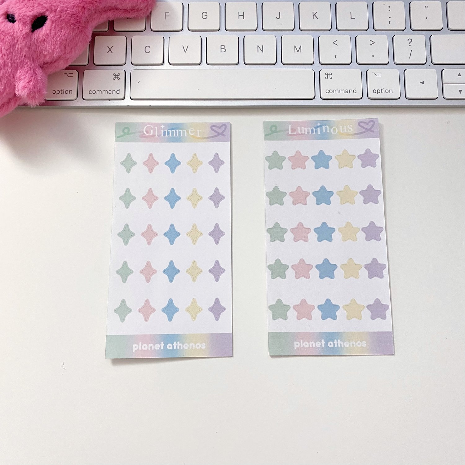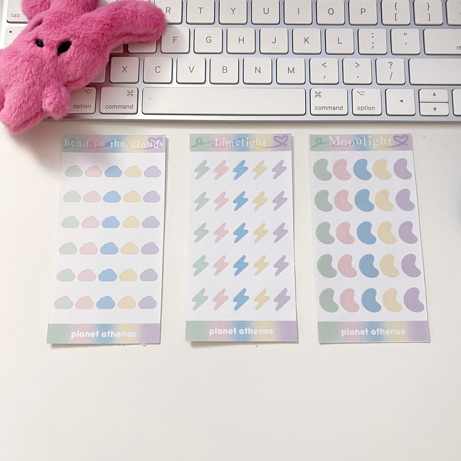 This collection include the moonlight, glimmer, luminous, limelight, and head in the clouds sticker sheet>