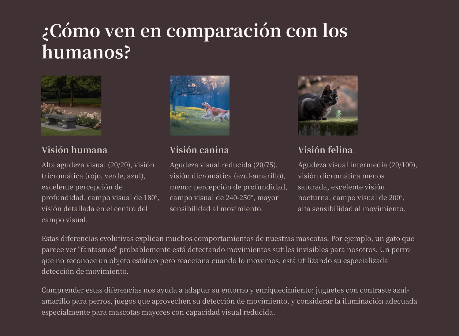 - Cómo ven realmente perros y gatos: diferencias clave entre la visión humana y la de nuestras mascotas, sensibilidad al movimiento, percepción de colores y visión nocturna.