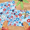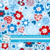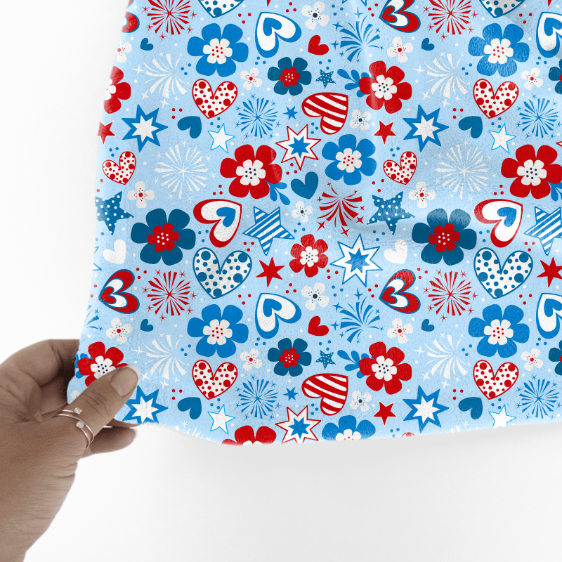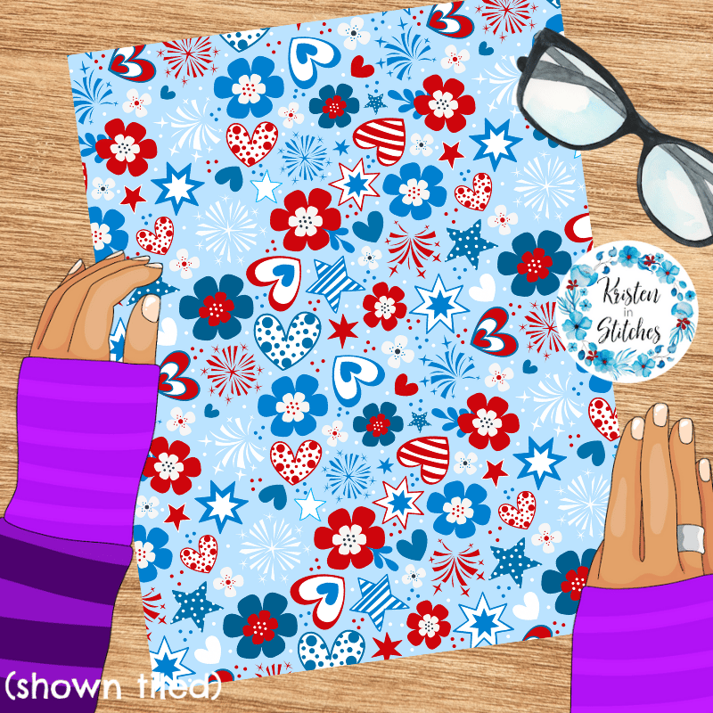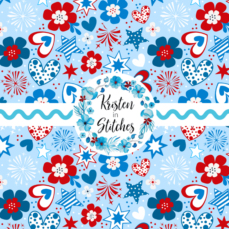 Colorful red, white and blue whimsical flowers, hearts, starts and fireworks.