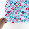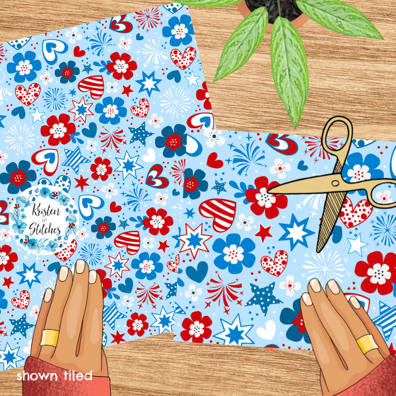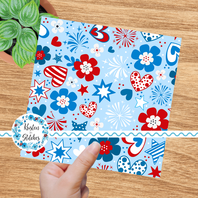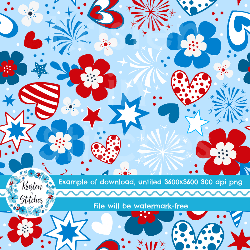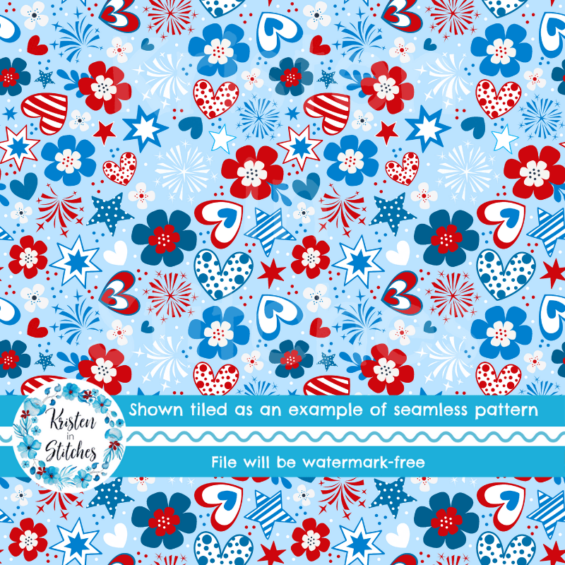 Patriotic Whimsy Seamless Pattern, Red White Blue Floral Fourth of July Flowers, Stars, Hearts