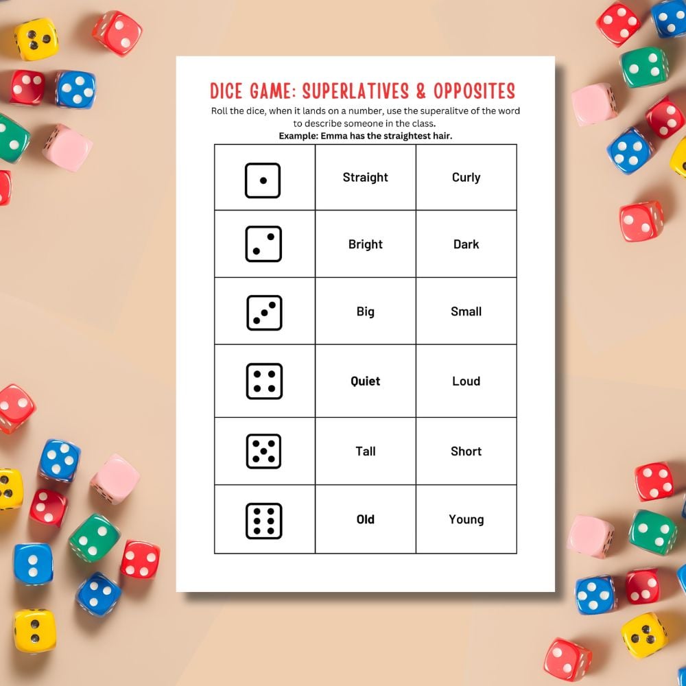 Roll the dice and when it lands on a number, choose the word to describe someone in the class.