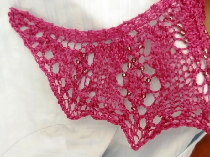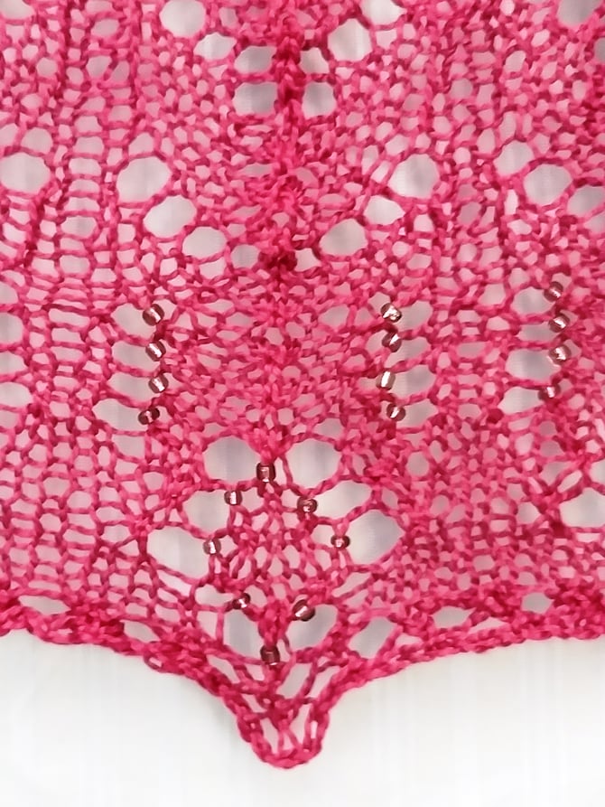 This is a one-skein crescent shawl with a difference. There are no stockinette or garter stitch sections – instead, graceful lace flows uninterruptedly outwards towards the very tips, and downwards towards the beaded diamond border.