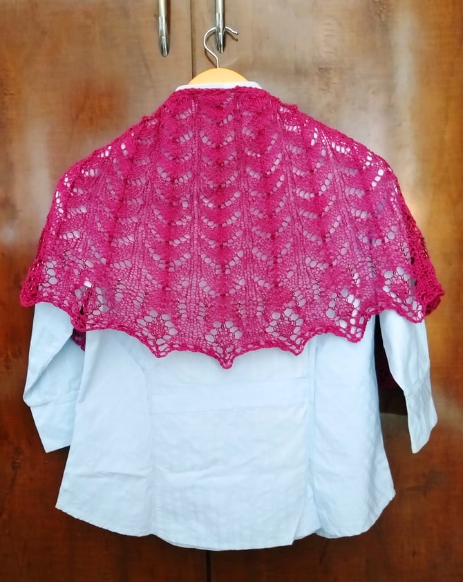Dark pink shawl: 55” (140cm) along top edge, 90” (229cm) along bottom edge, 15” (38cm) height at center