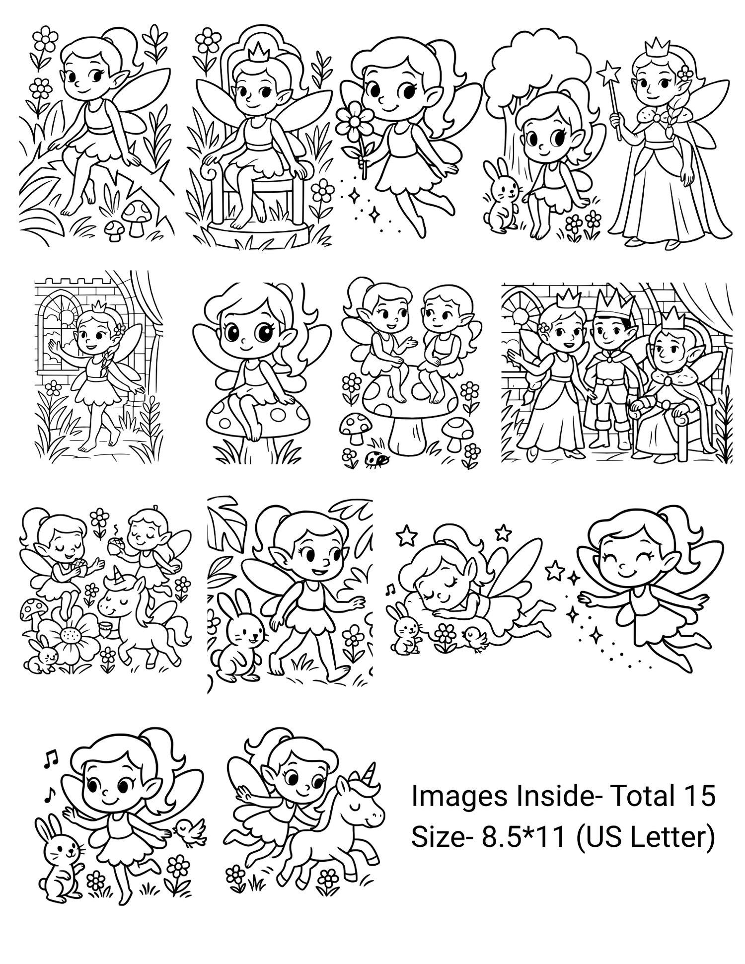 - 15 unique fairy coloring pages (no repeats)