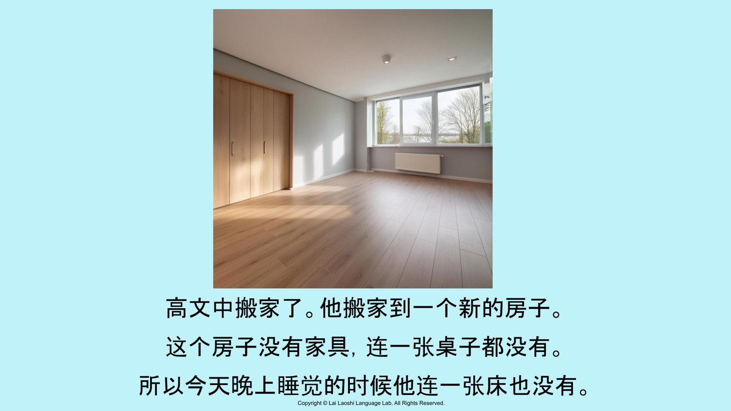 高文中搬新家,家具全无,连张桌子都没有。他忘带钱包,向邻居借钱未果,又向邻居借食物和水,均被拒绝。邻居的冷漠让他感到难过。故事大量运用“连...都...”结构,突出邻居的贫困,引发读者共情。
