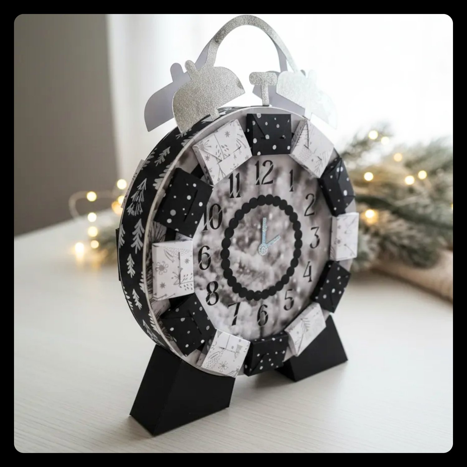 Cette fois, on met les mains dans le papier pour créer un calendrier de l’Avent en forme de réveil ⏰ — un projet original et plein de charme qui fera briller ton atelier de mille feux ! ✨