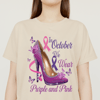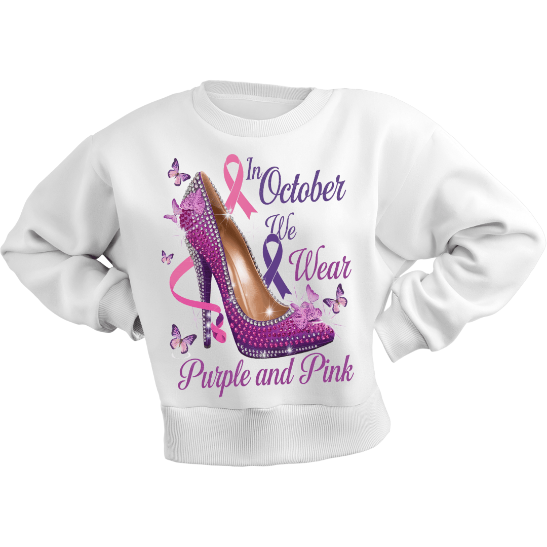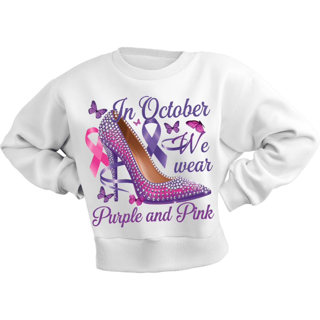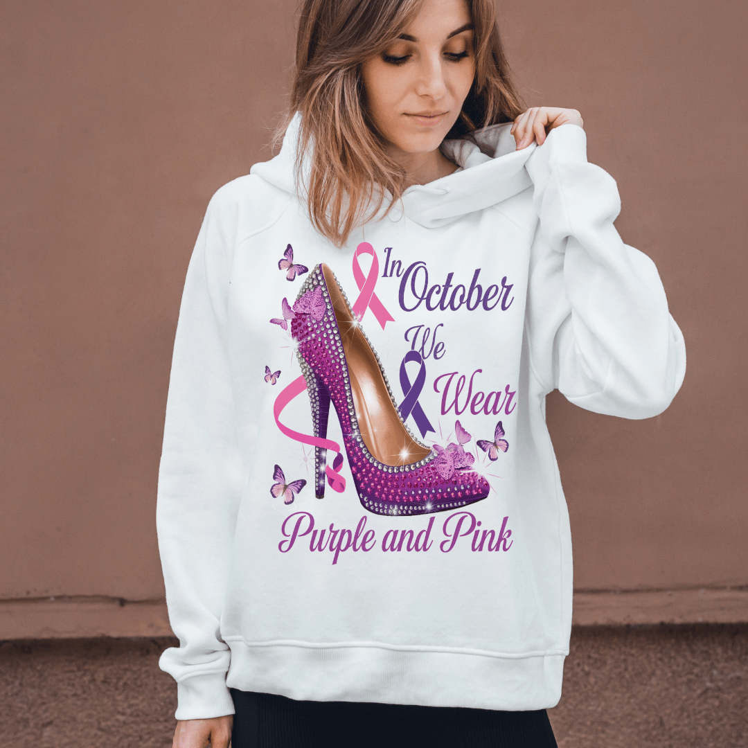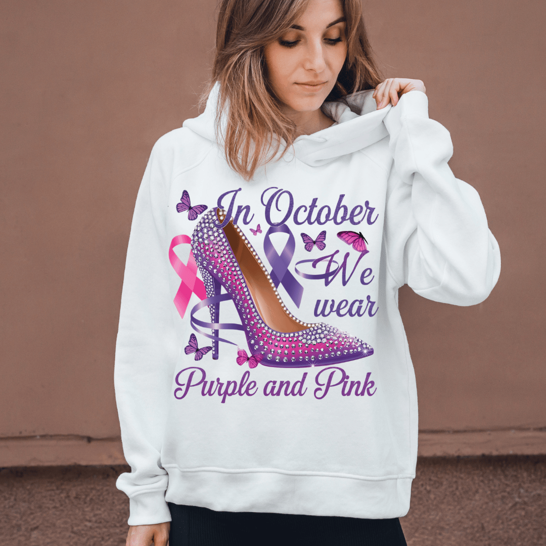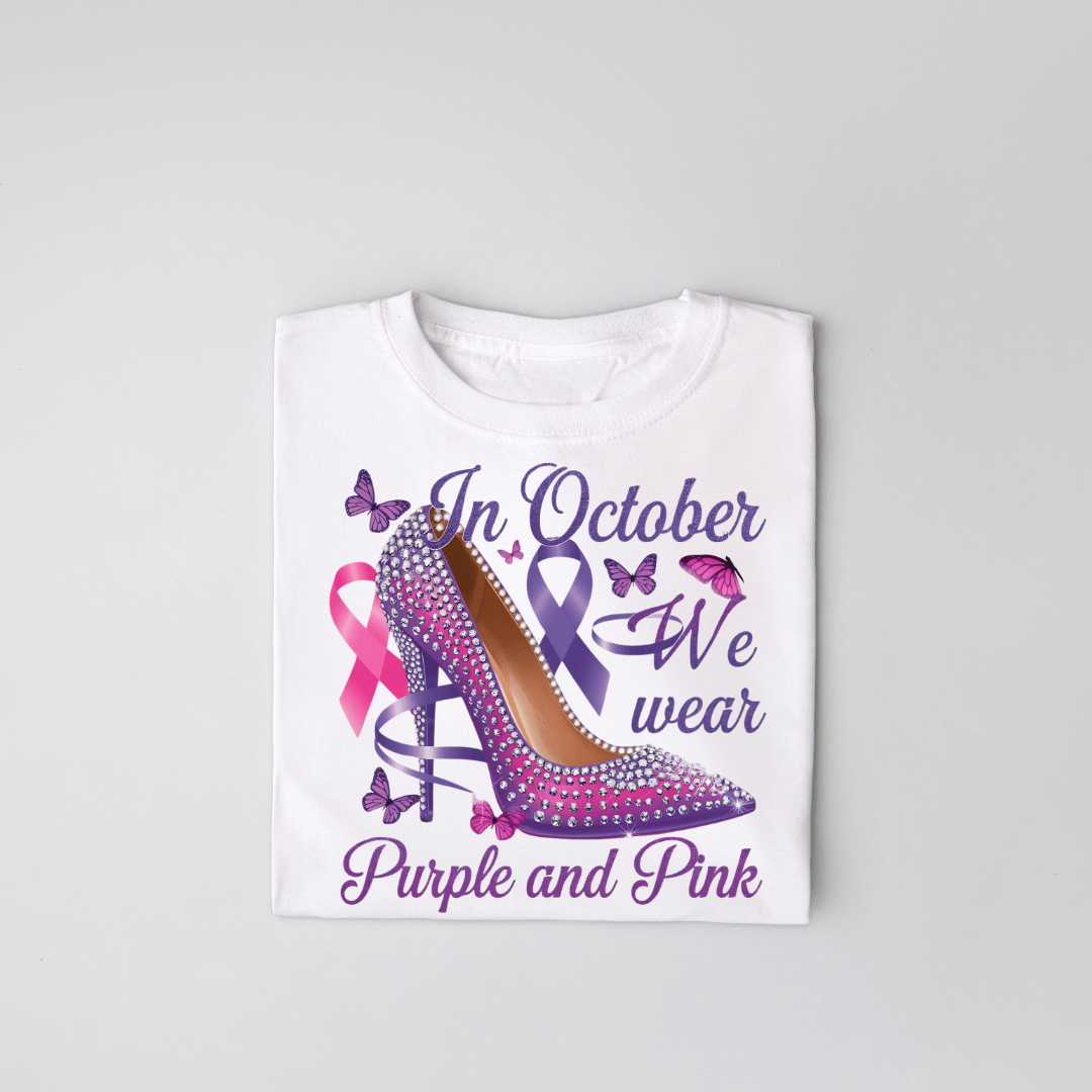 Show your support for two important causes with this stunning "In October We Wear Purple and Pink" digital design! Featuring a dazzling high heel adorned with purple and pink ribbons, this design raises awareness for both Breast Cancer and Domestic Violence Awareness Month.