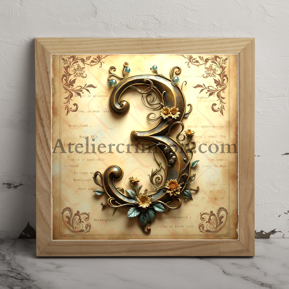 Number 3 Art Nouveau alchemical Each character crafted as a stunning 3D brass sculpture with weathered patina, set against a mystical alchemical parchment. Ornate vines, floating bubbles, and antique gears create a magical shabby chic atmosphere. Perfect for vintage-inspired designs, book covers, or unique wall art."