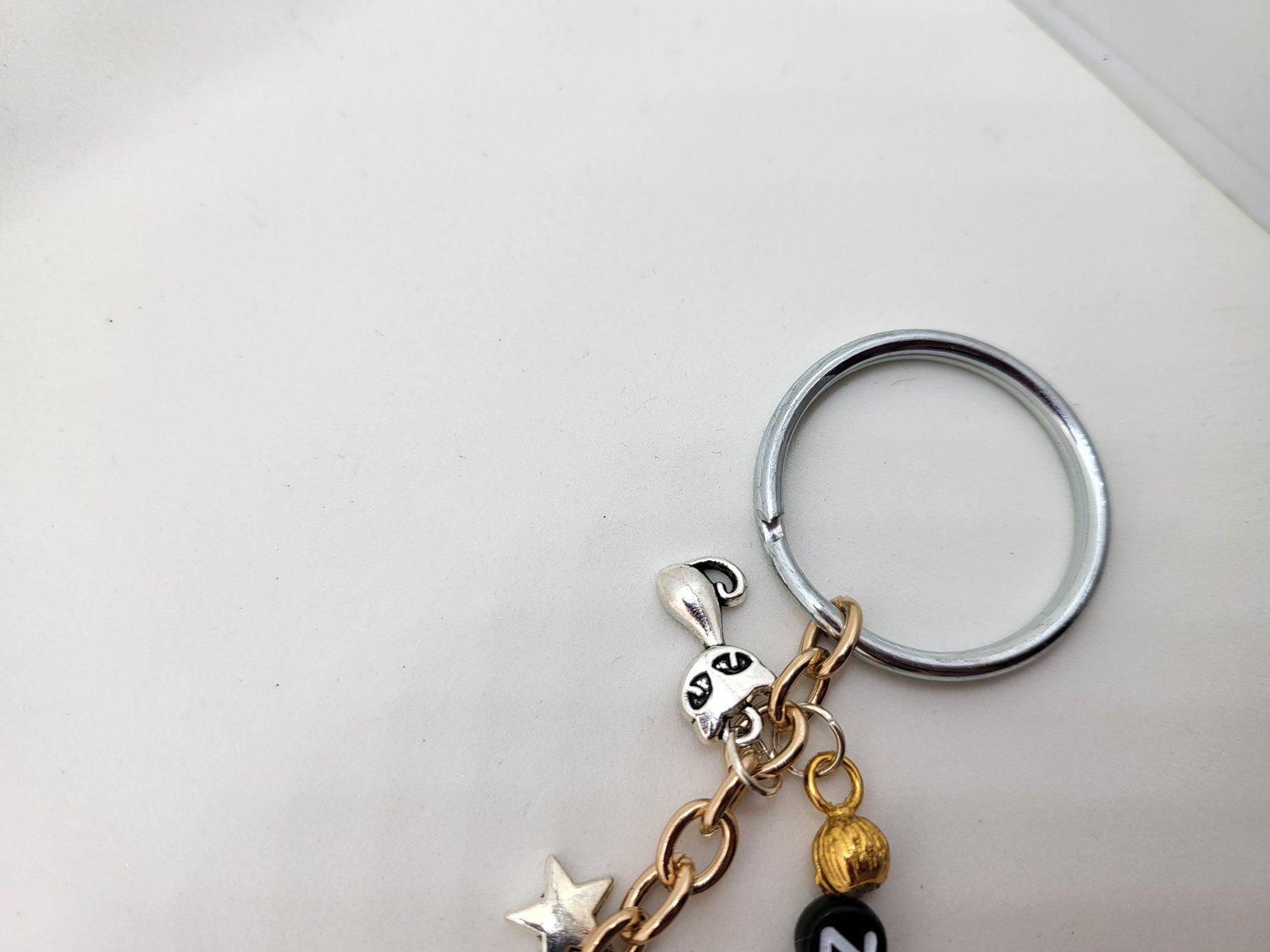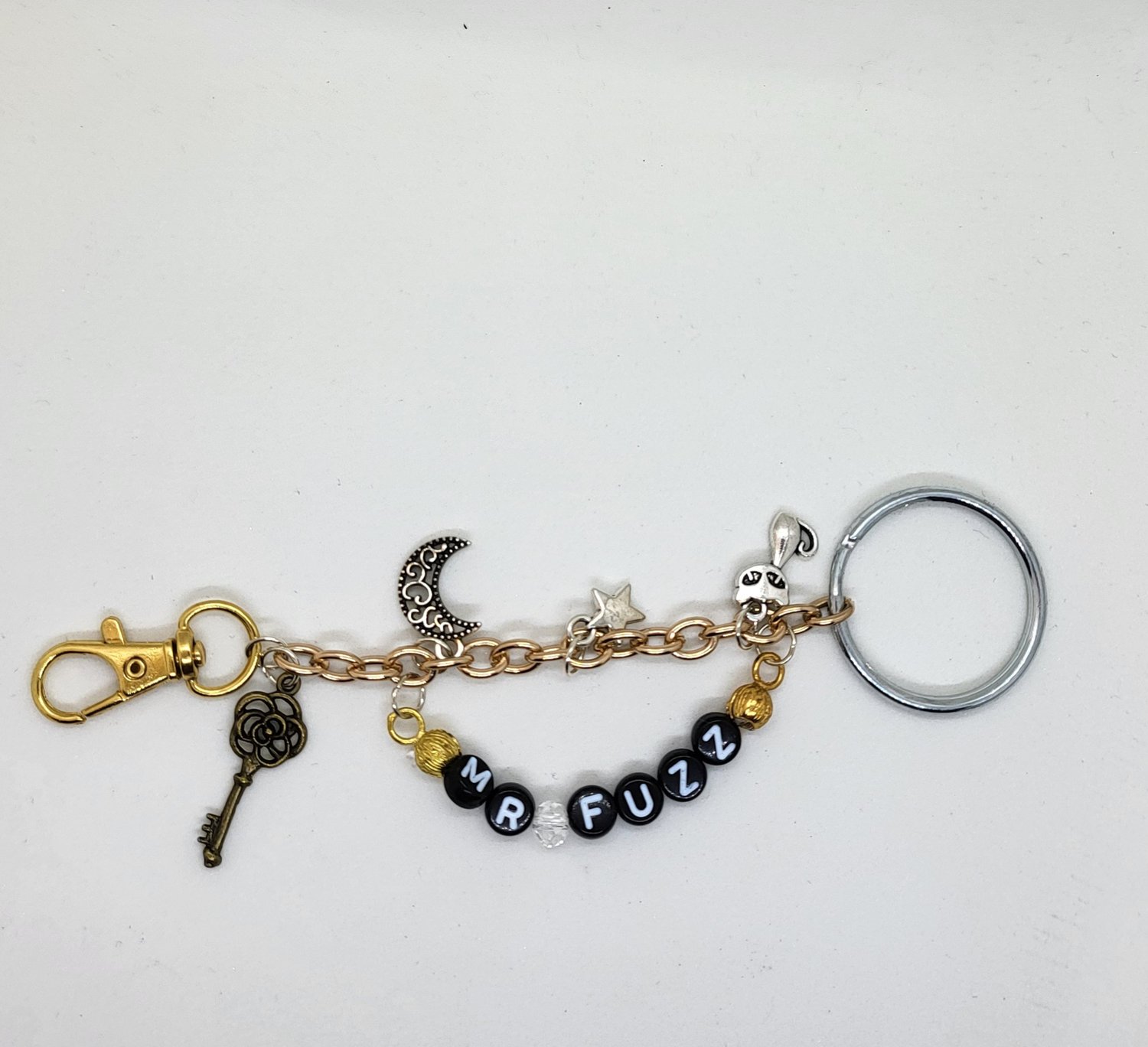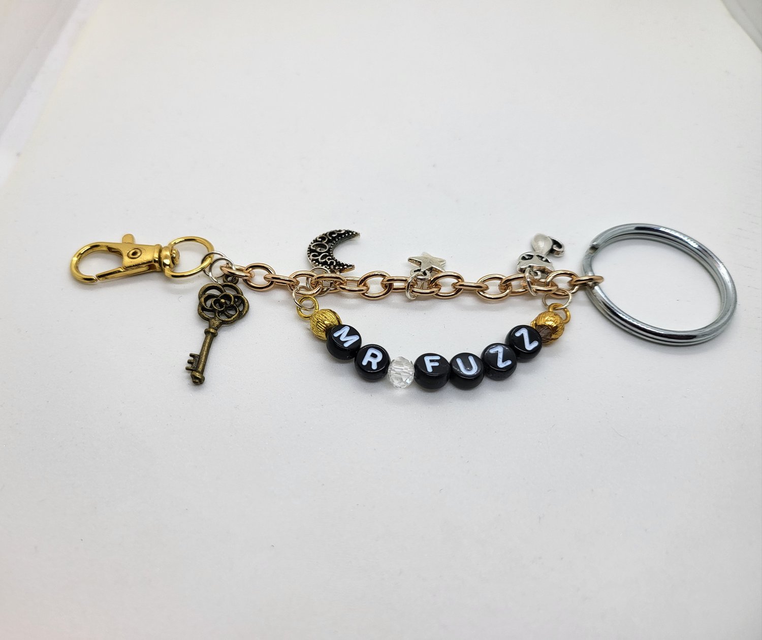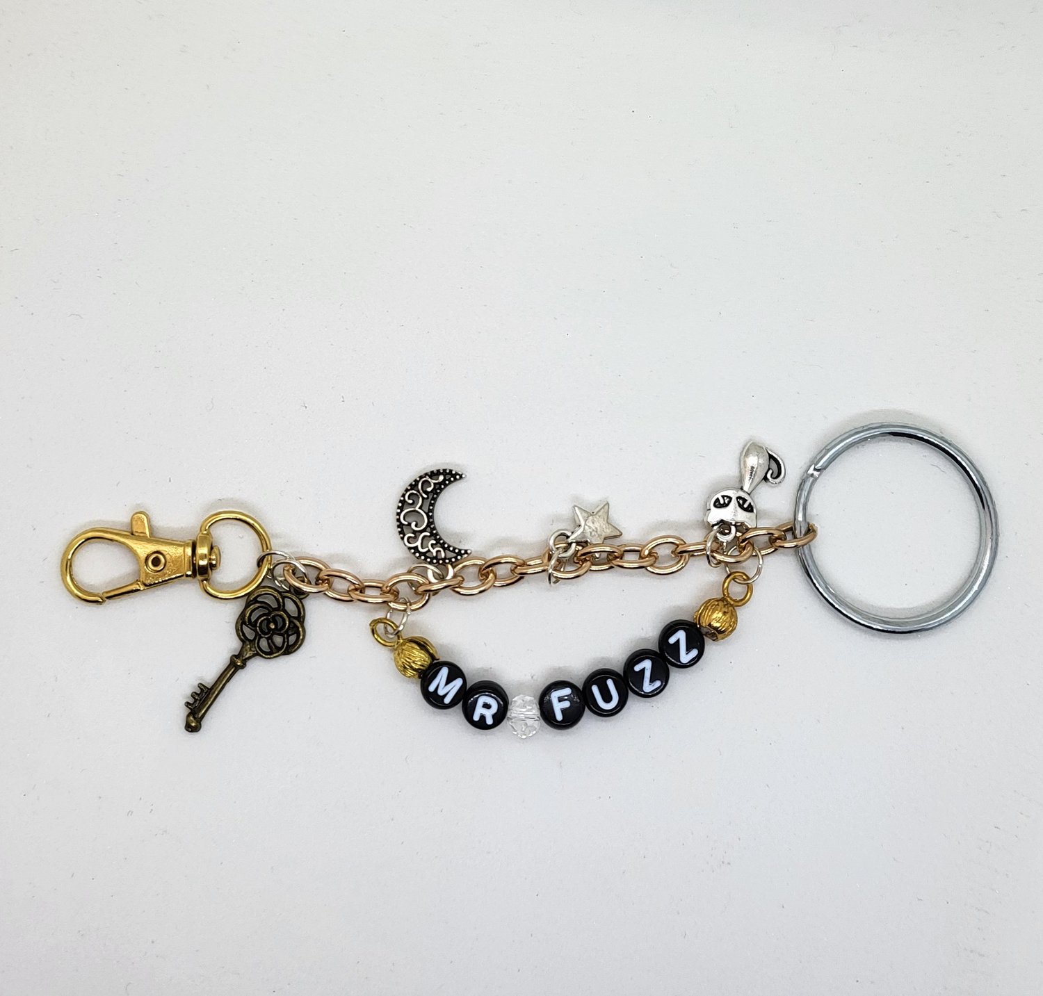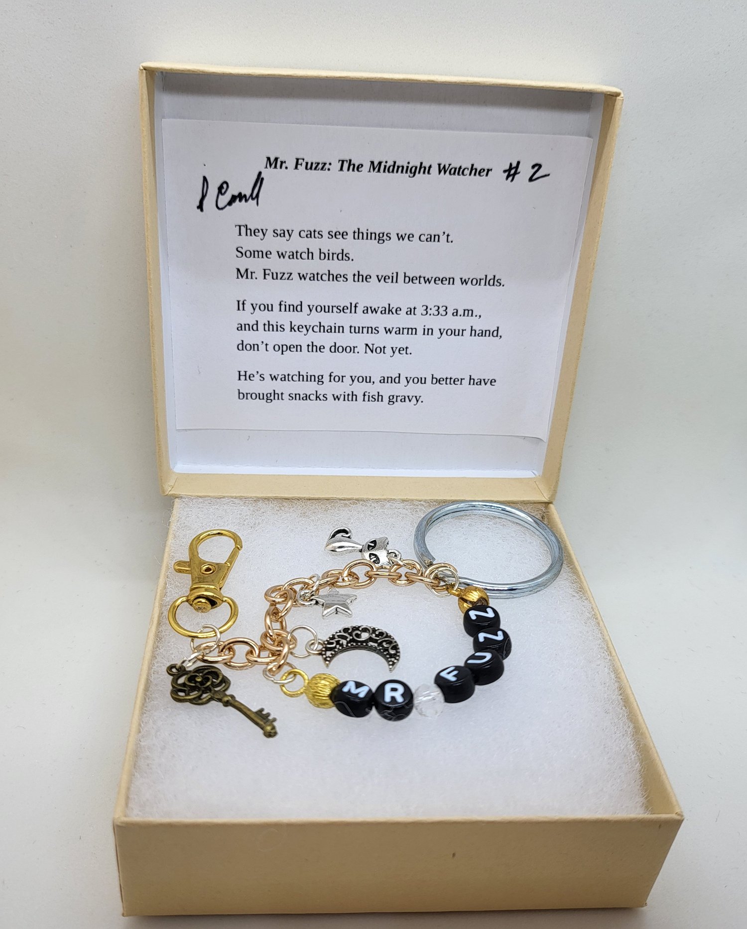 A gothic keychain tribute to Mr. Fuzz, the feline guardian of secrets. Features a split-ring keyring, lobster claw clasp, and five symbolic charms: silver cat, crescent moon, vintage key, star, and letter beads spelling “Mr. Fuzz.”