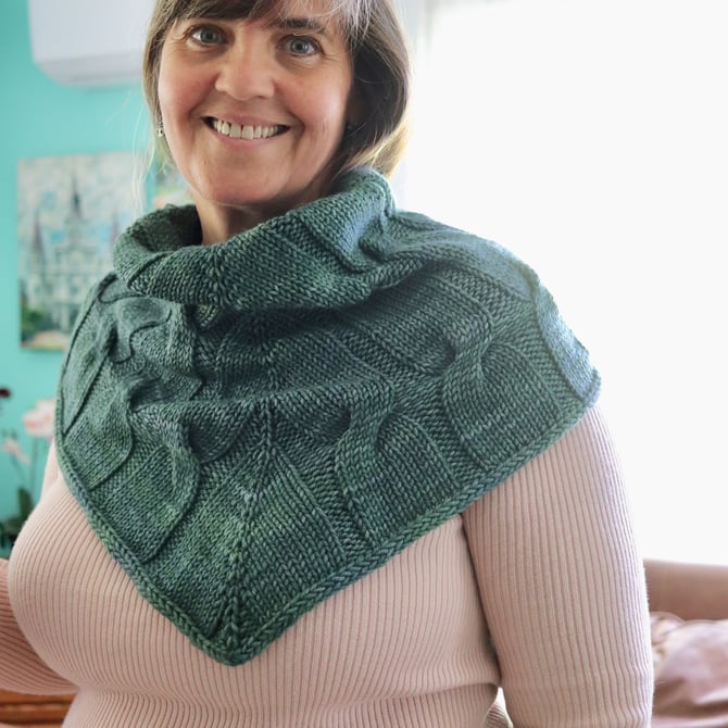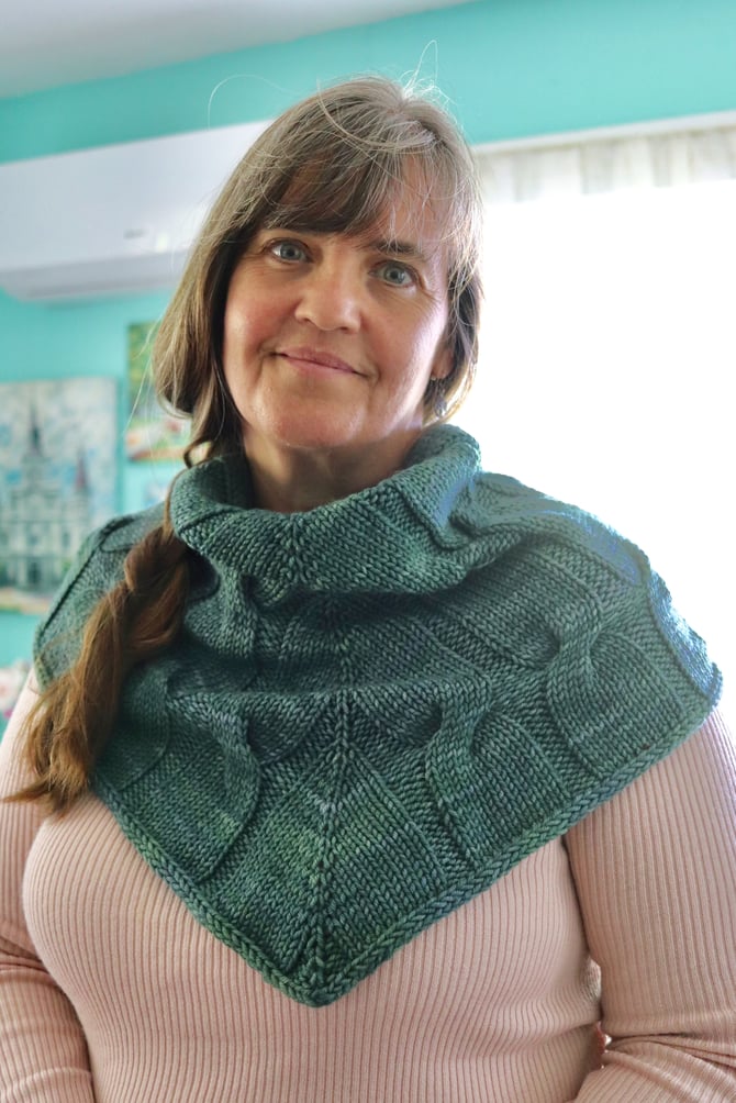 Grab a couple of worsted-weight skeins and knit yourself some chunky cables. The bandana shape makes it so easy to style – just pull it over your head and go. I like to wear the point offset from the center (I think it looks jaunty) but you be you! Wear it how you want.