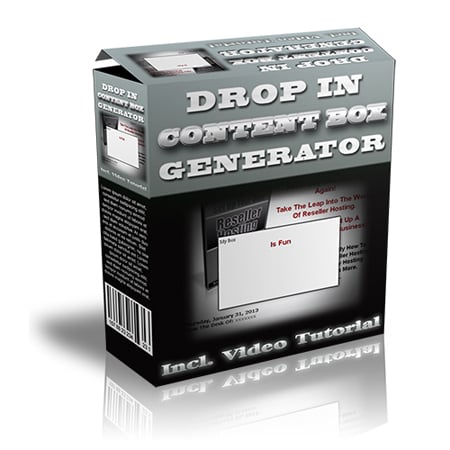 Easy to use Personal Use software Drop In Content Box Generator creates a configurable content box that drops into your website for a specified duration. Includes video tutorial.