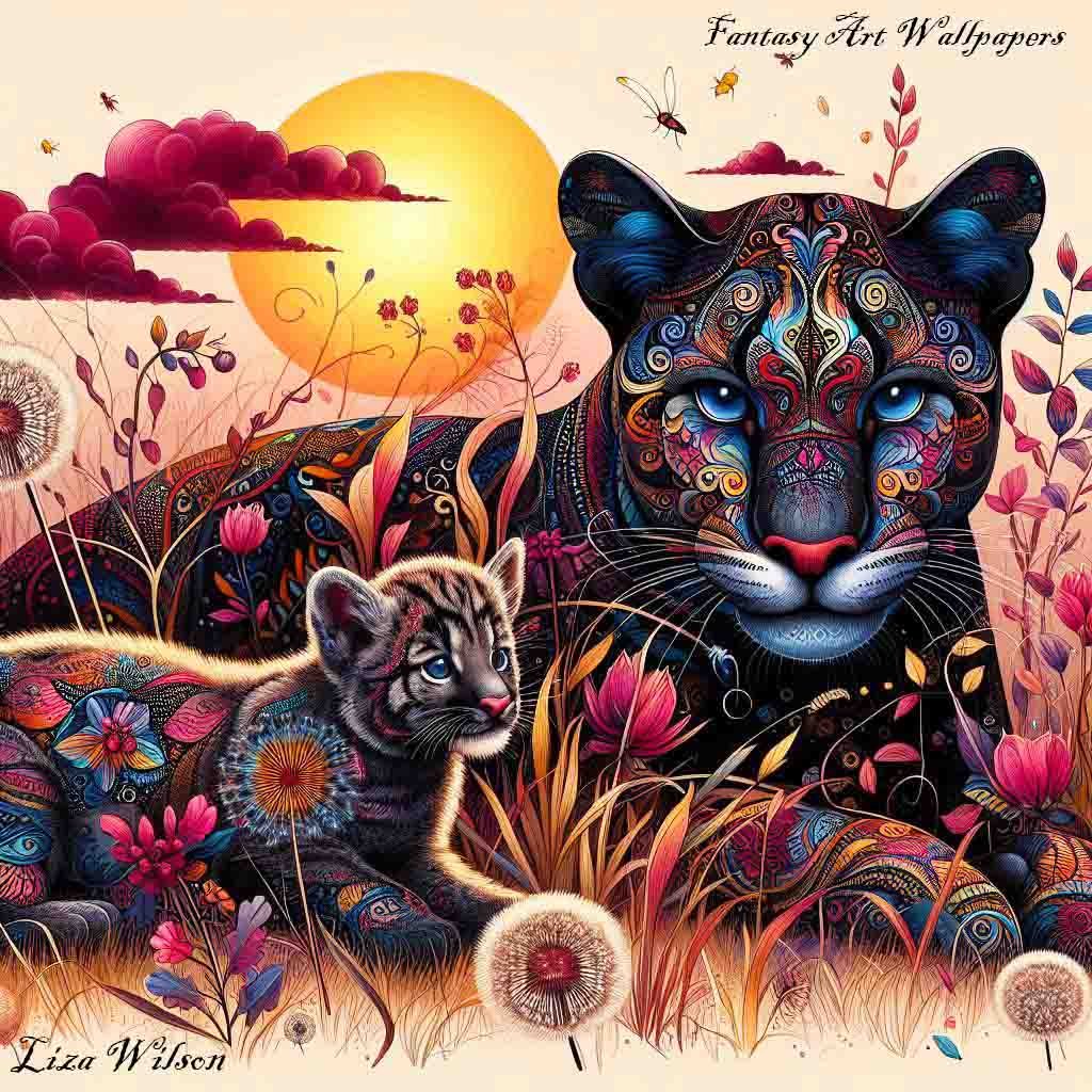 Patterned black Pumas under a low setting sun & burgundy skies. There are colourful flowers & grasses.