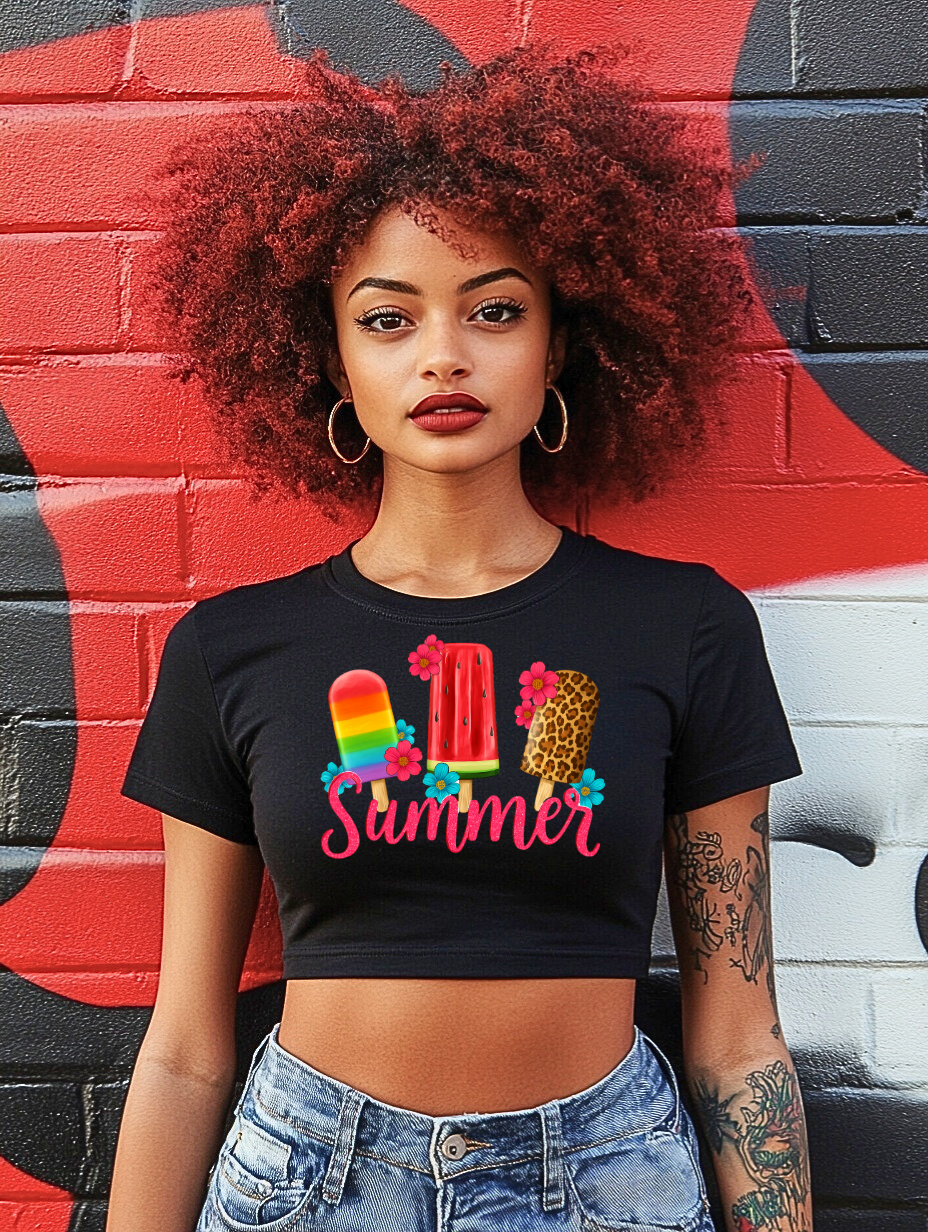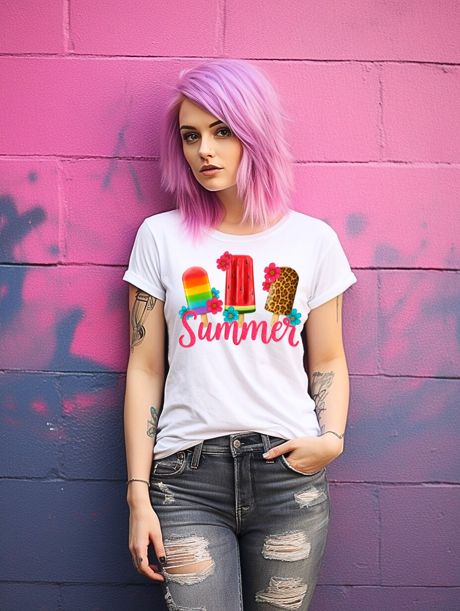 This bright and fun summer-themed design features a trio of popsicles: rainbow, watermelon, and leopard print—all decked out with vibrant tropical flowers and sparkling pink script that reads “Summer.” It’s perfect for girls’ summer tees, beach day bags, or sunny season crafts!