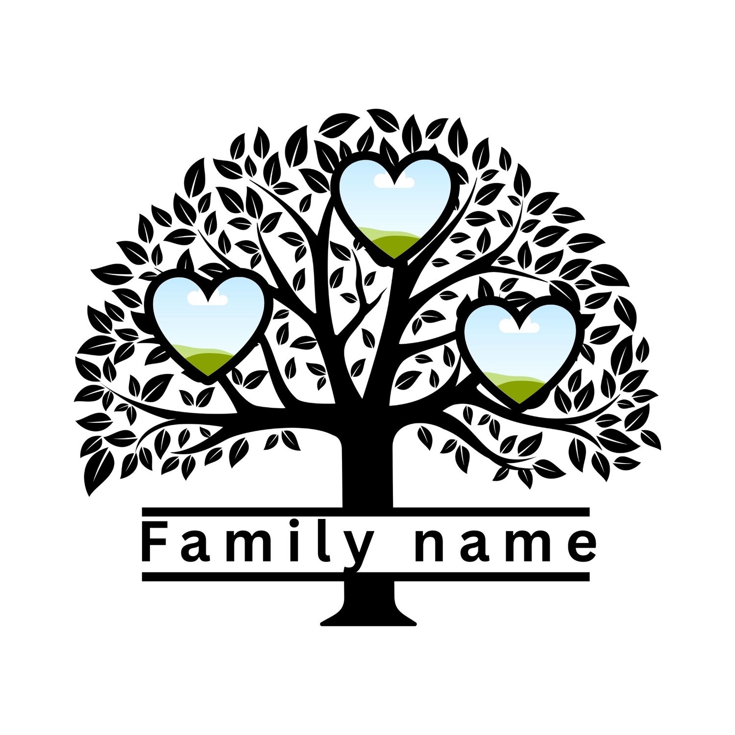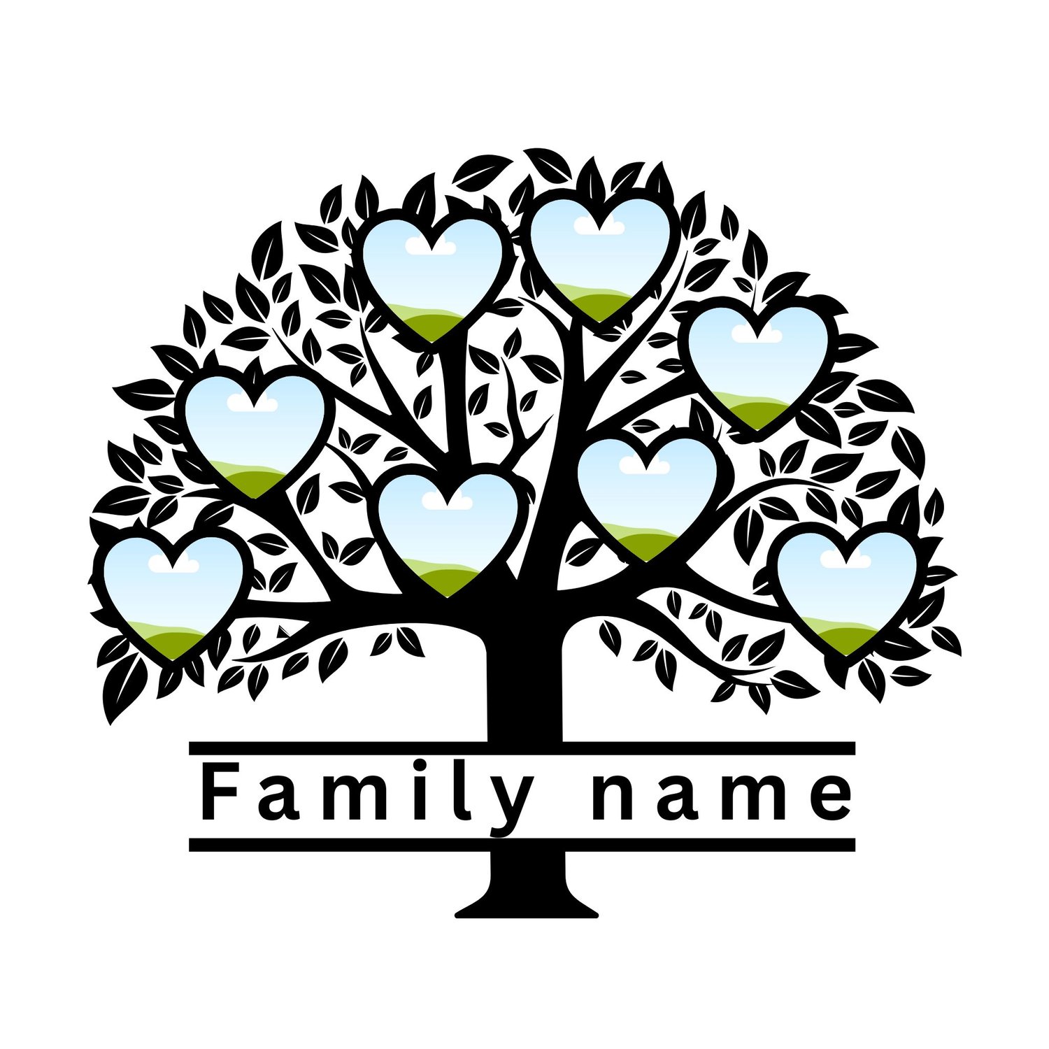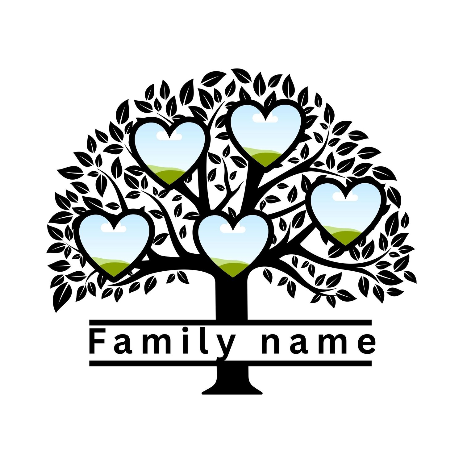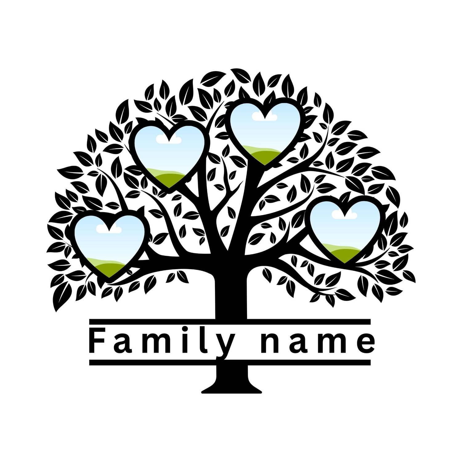 Celebrate your family's roots with this elegant Family Tree Heart Frame Template. Designed with a classic black tree silhouette, this customizable digital file features heart-shaped photo placeholders perfect for showcasing your loved ones.