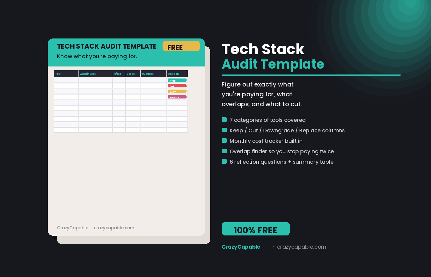 The Tech Stack Audit Template walks you through every tool in your business — organized by category — so you can see exactly what you're using, what it costs, what overlaps, and what to cut.