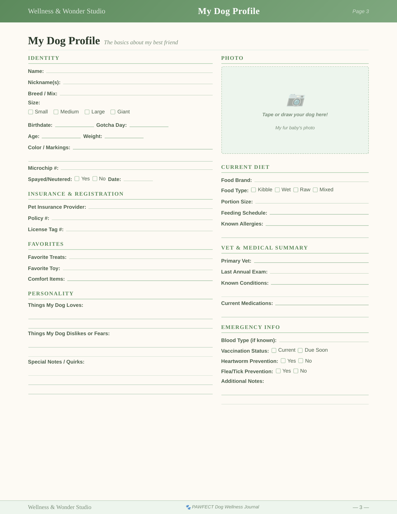 This printable journal helps you track everyday care habits, wellness notes, routines, and observations so you can stay consistent and thoughtful about your dog’s wellbeing. Designed to be practical, easy to use, and family-friendly, it’s a helpful companion for dog lovers who want a simple way to stay on top of care.