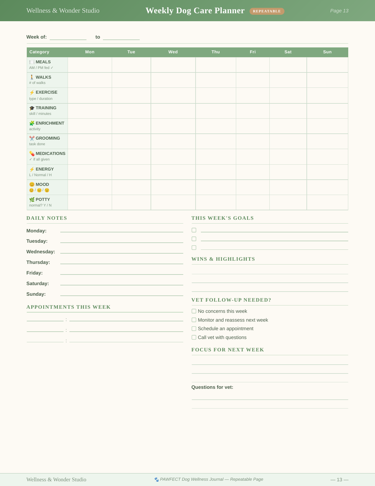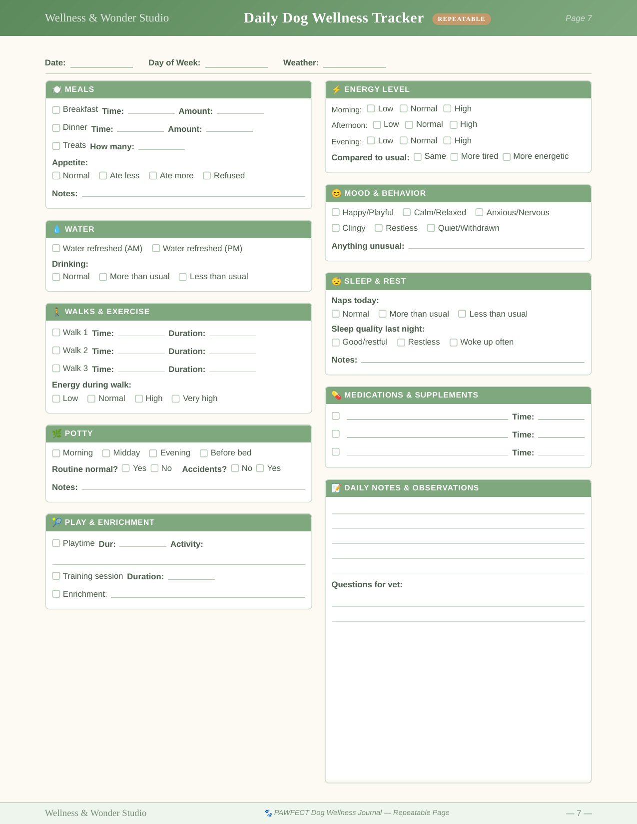 Use it for daily routines, grooming notes, food observations, activity tracking, and general wellness reflections.
