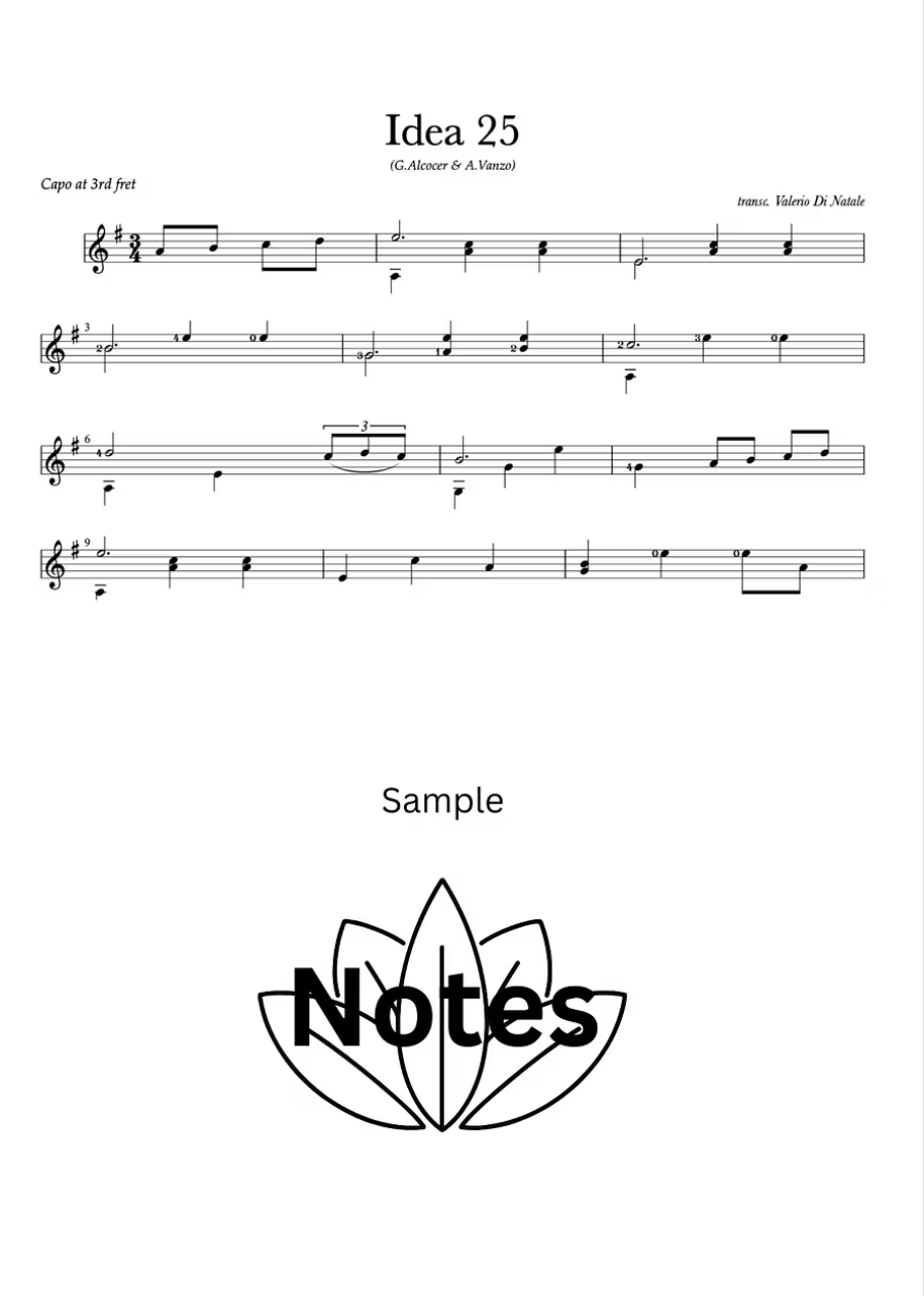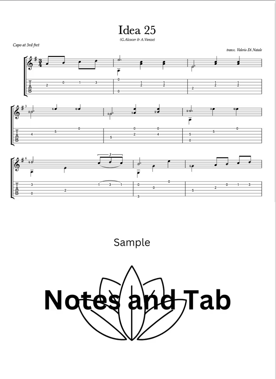 Explore my transcription of Idea 25, the expressive piano piece by Gibran Alcocer and Andrea Vanzo, now adapted for guitar. This transcription is available in three formats to suit your preferences: