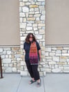 An asymmetrical triangle scarf that begins at the point with just one stitch.  It increases from there on just one side to a nice scarf width.  Then it continues evenly until all patterns are worked.  Then Edged in 2 different colors and stitches.