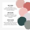 + Detailed Hex Codes, RGB, and CMYK values for each color