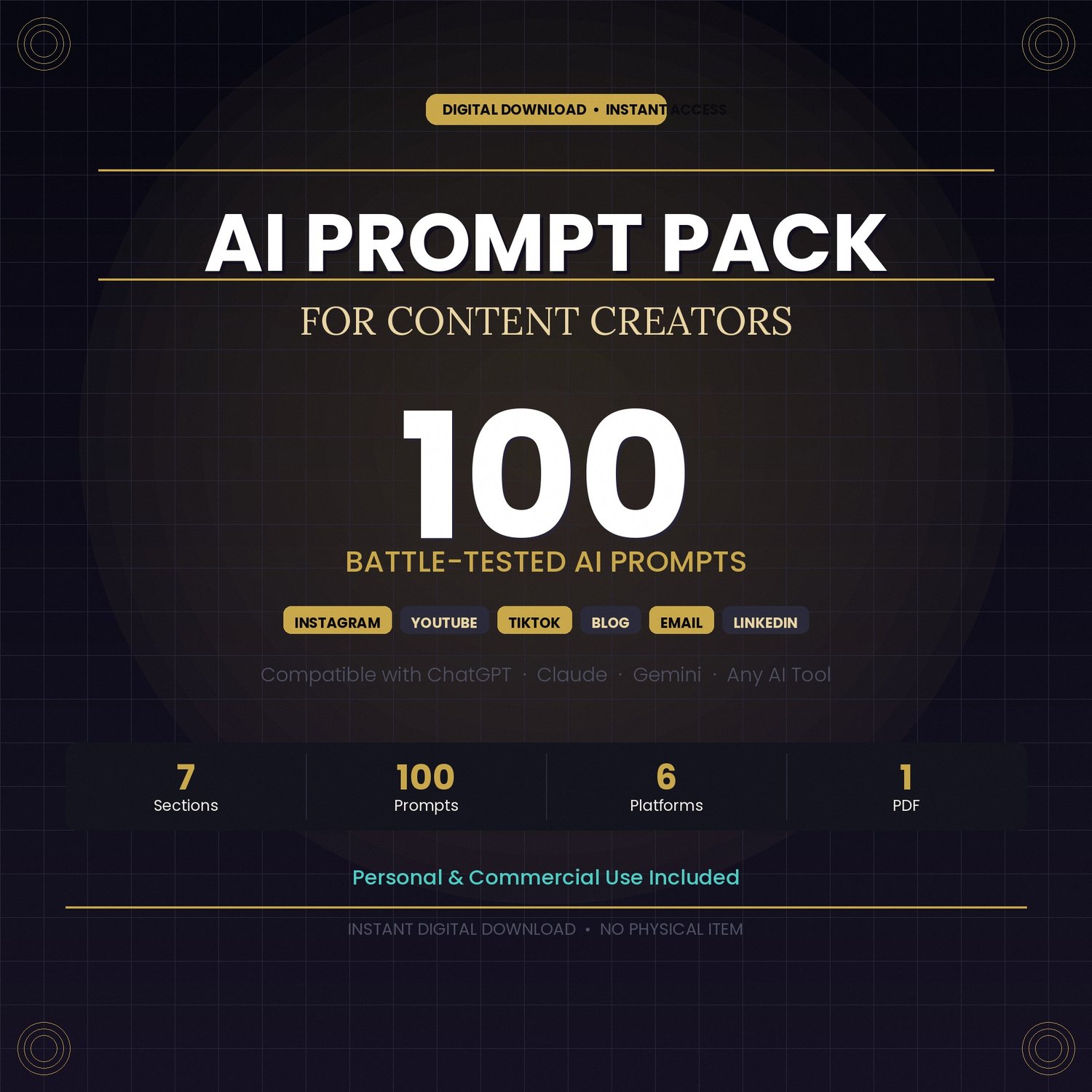 Inside this instant-download PDF, you’ll find 100 battle-tested AI prompts organized by platform so you can find exactly what you need in seconds: