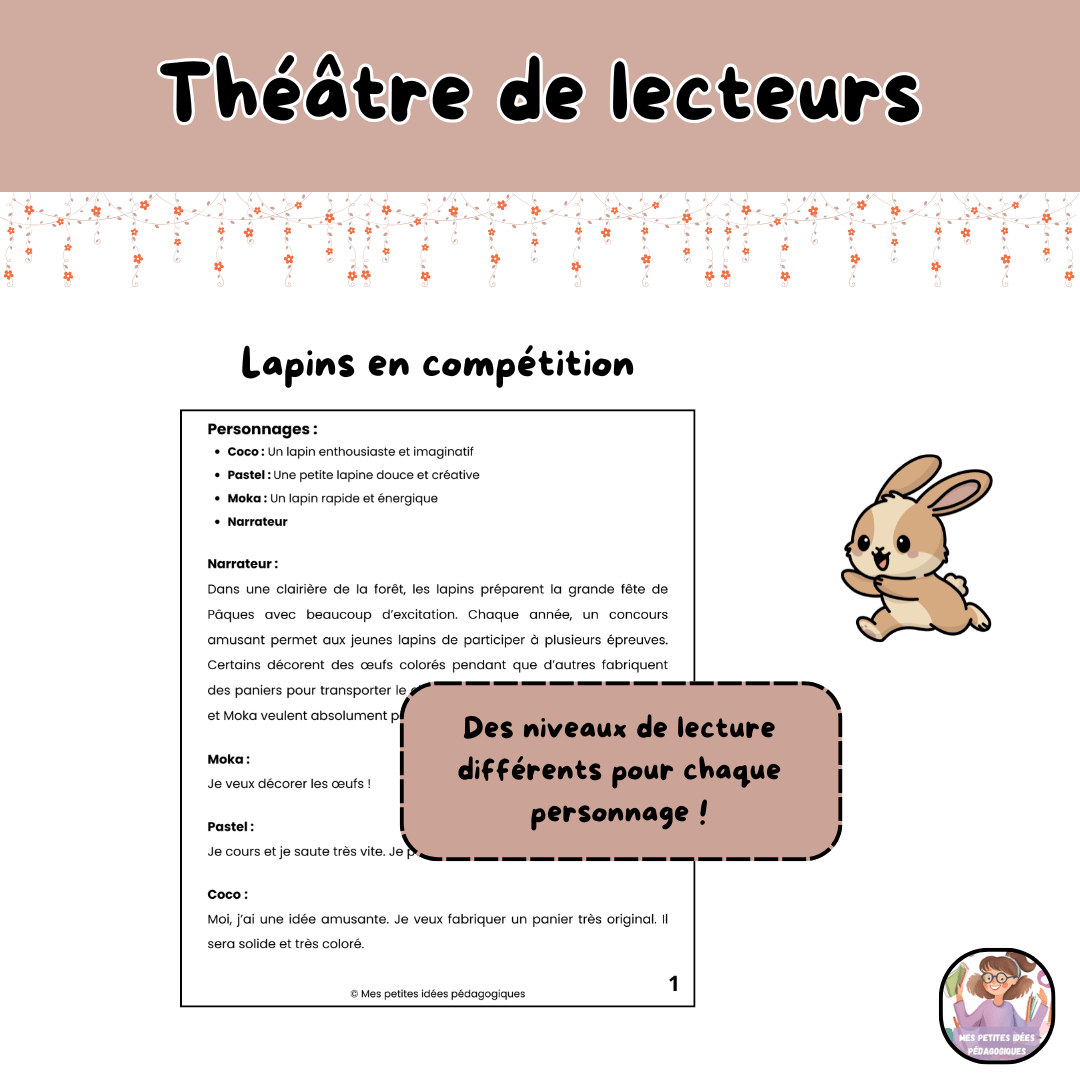 Le document peut être utilisé avec des élèves de niveaux scolaires variés selon leur habileté en lecture et en fonction de l’intention pédagogique recherchée. Ce matériel peut donc être utilisé dans divers contextes (classe, orthopédagogie). Vous trouverez une histoire sous le thème de Pâques comprenant trois personnages ainsi qu’un narrateur.