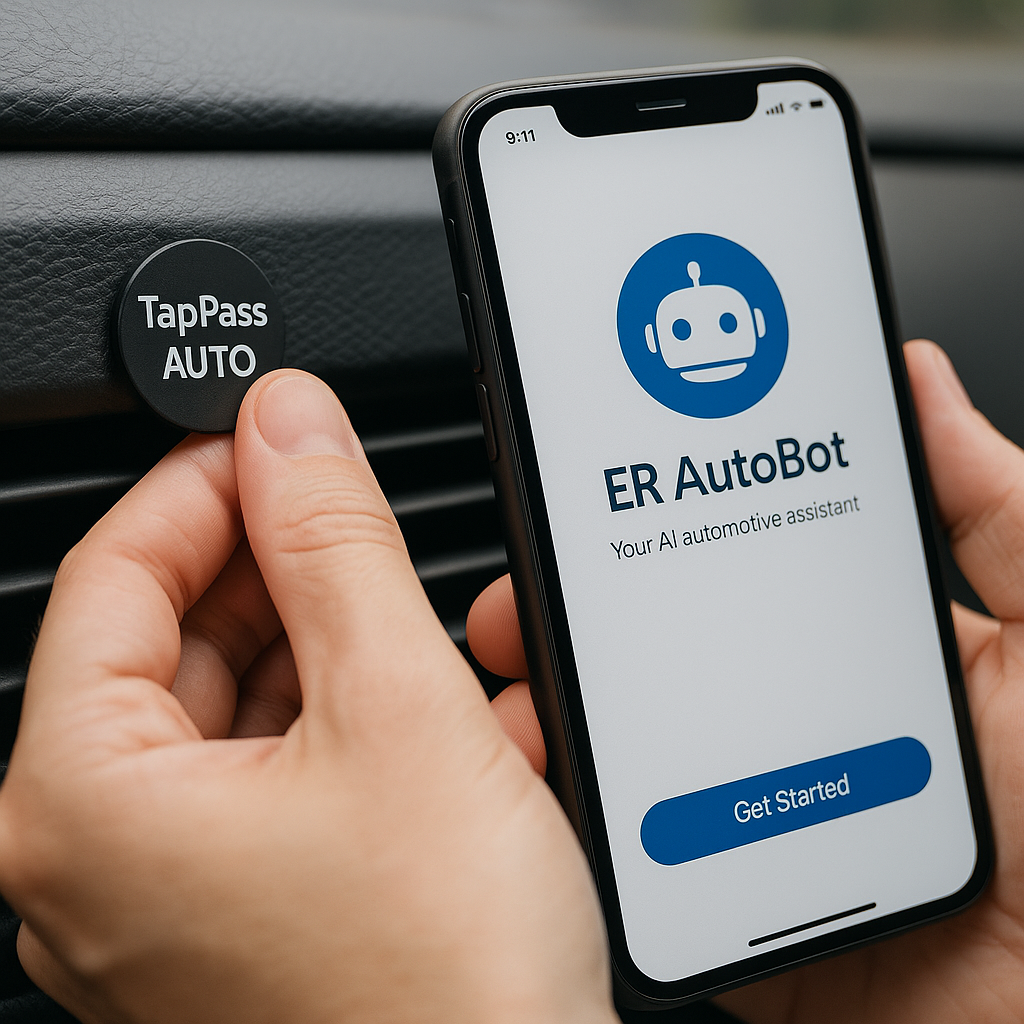 TapPass Auto is about the size of a quarter, but it delivers big results. Just stick it on your dashboard or center console, tap your phone, and instantly launch ER AutoBot — your custom AI mechanic assistant.