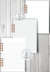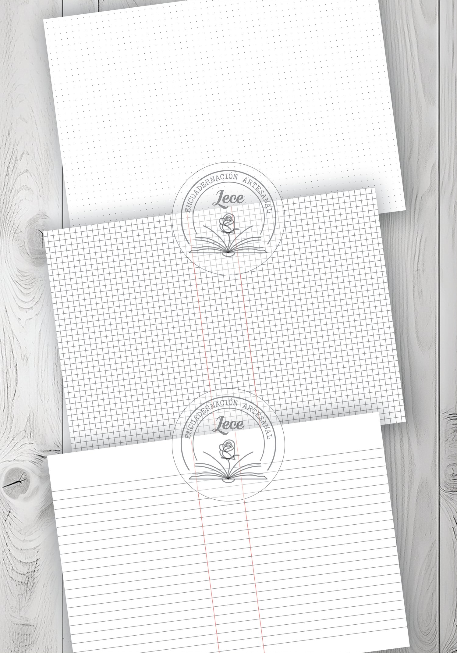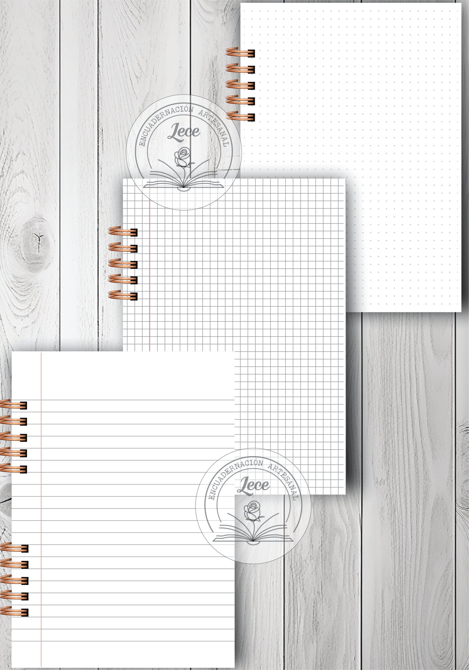 - 3 modelos de interiores: rayado, cuadriculado y punteado y sus variantes para imprimir en tamaño A5 para anillado y para doblar y coser o abrochar