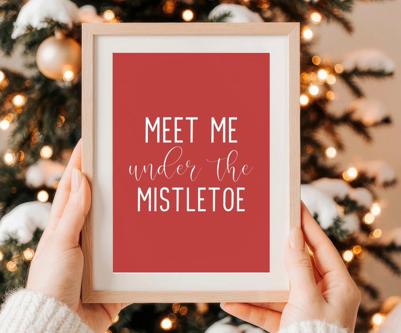 Add a touch of holiday romance to your home with this “Meet Me Under the Mistletoe” printable wall art. Featuring elegant white typography on a warm Christmas red background, this modern minimalist design is perfect for cozy holiday decorating. Display it in your bedroom, living room, or entryway for a festive and flirty touch.