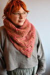 The cowl is knit flat on the bias in two-color Brioche. The two short edges are seamed (or crocheted together) and form the back of the neck. Cables are only worked on the right edge. The 8-stitch cables alternate between right and left-crossing (4-stitches crossing over 4-stitches). The cowl can be worn folded, rolled, or unfolded and with either side out.