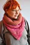 A reversible bandana-style cowl with Brioche cables, knit flat with two colors.
