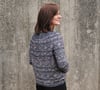 The wearer is 5’10” / 178 cm with a 37” / 92.5 cm chest circumference. The sample has been worked in size 4, giving the wearer 7” / 17.5 cm of positive ease at the chest. To accommodate the height of the wearer, an extra 0.5” / 1.5 cm of depth has been added to the yoke, and an extra 2” / 5 cm of length has been added to the body and sleeve length. The sleeve circumference extension has not been worked.