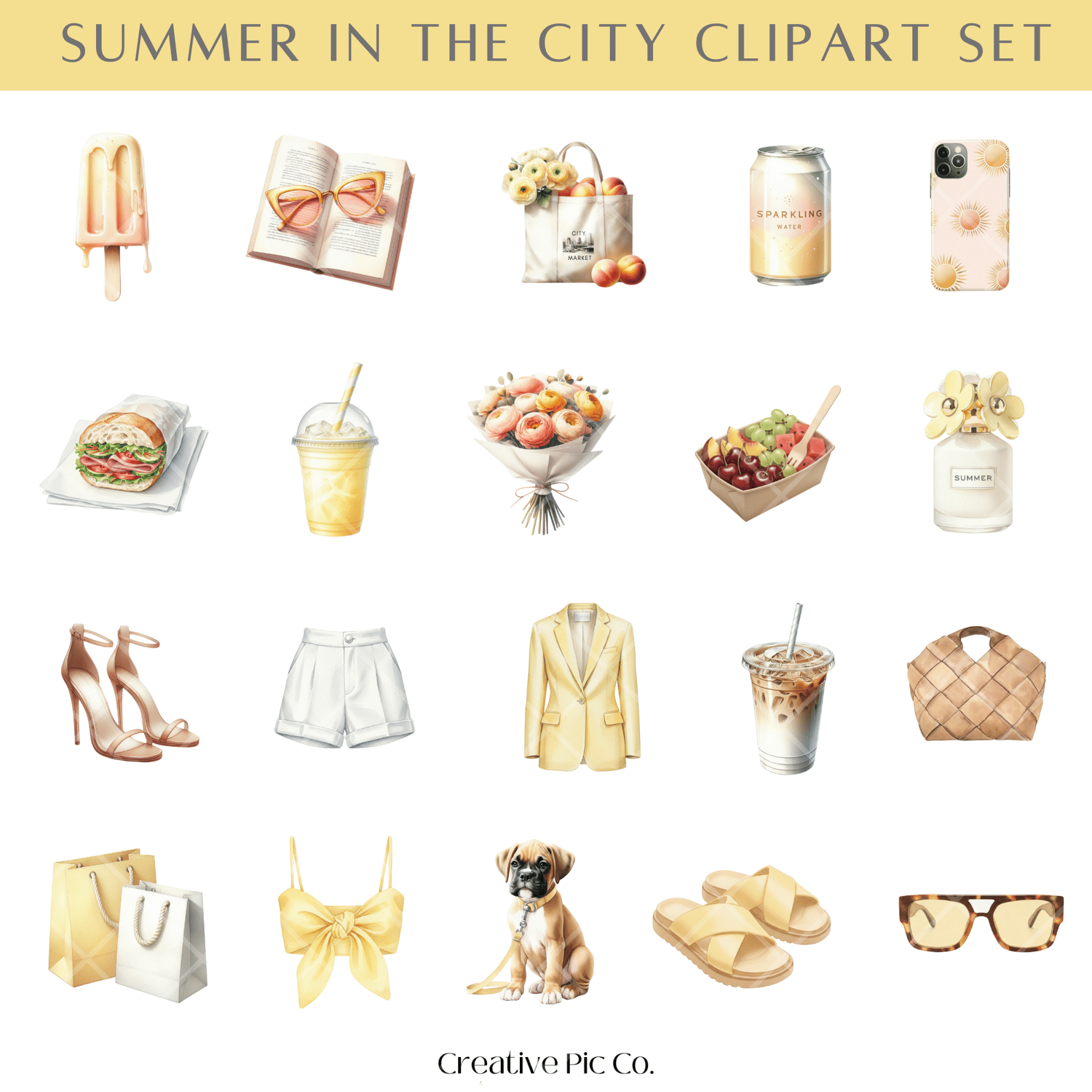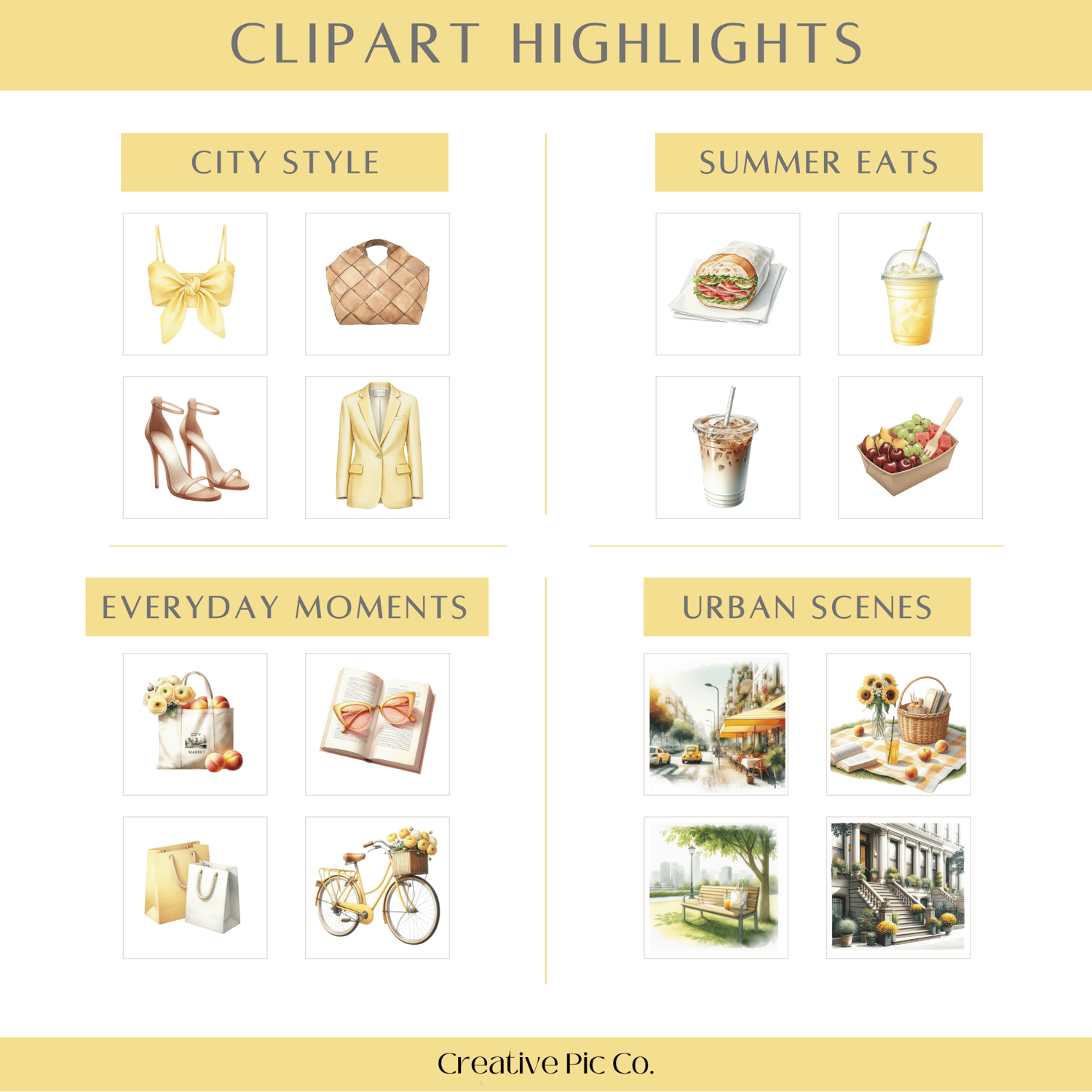 Bring the warmth of sunshine and chic city vibes into your creative projects with the Summer in the City Clipart Set. This bundle of 40 PNGs captures everything stylish about summer: trendy yellow outfits, iced drinks, market baskets, sunglasses, fresh food, bicycles, and modern city scenes.