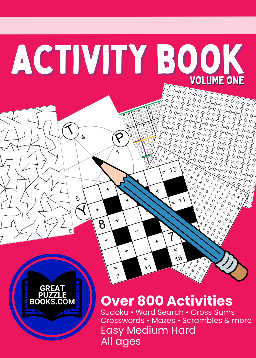 Get ready for hours of fun and enjoyment. With more than 800 activities (only $.006 each), this Activity book is the one that will keep you occupied. You will find Easy, Medium, and Hard puzzles in this volume. Something for all ages - while mostly intended for adults, keep the kids around - they can often give a clue.