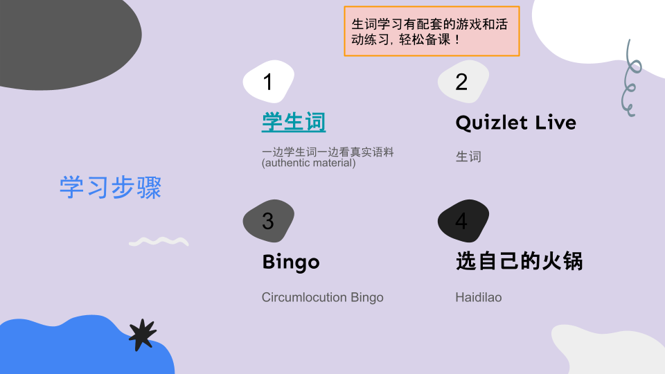 - Quizlet文件夹 + Gimkit:互动学习工具,增加学习乐趣。