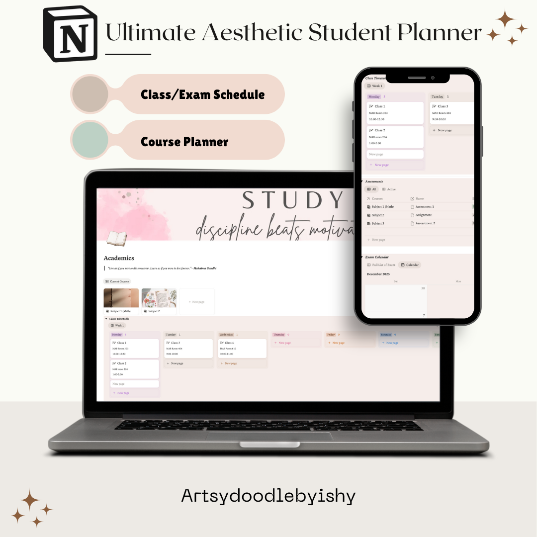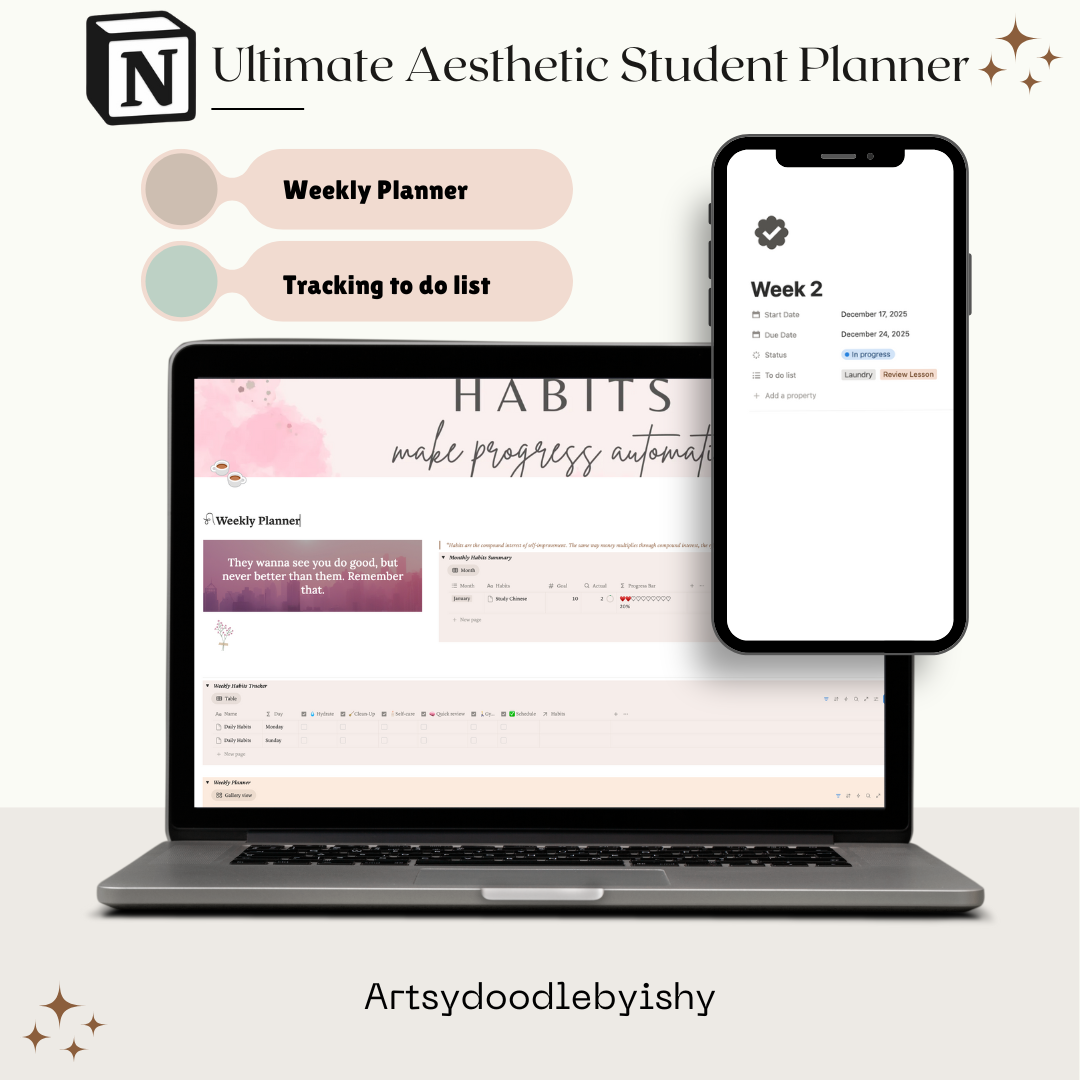 Stay organized, motivated, and stress-free with the Ultimate Student Planner — the all-in-one Notion system designed to help you take control of your academic life and personal goals. Whether you’re in high school, college, or university, this planner gives you everything you need to plan your semester, manage your tasks, and keep your life balanced — all in one place.
