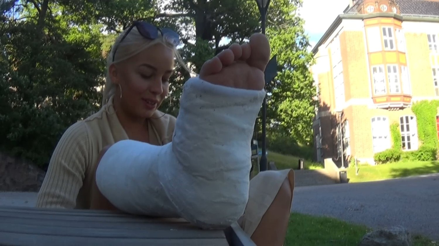 Trixie crutch with right leg in a white SLC along a gravel path.It's not the easiest thing but she fights on until some benches she finds where she sits and rests.She puts her casted foot on the table and we get some good close-ups.Trixie waves with the toes toward the camera.She then gently crutch on to the car.