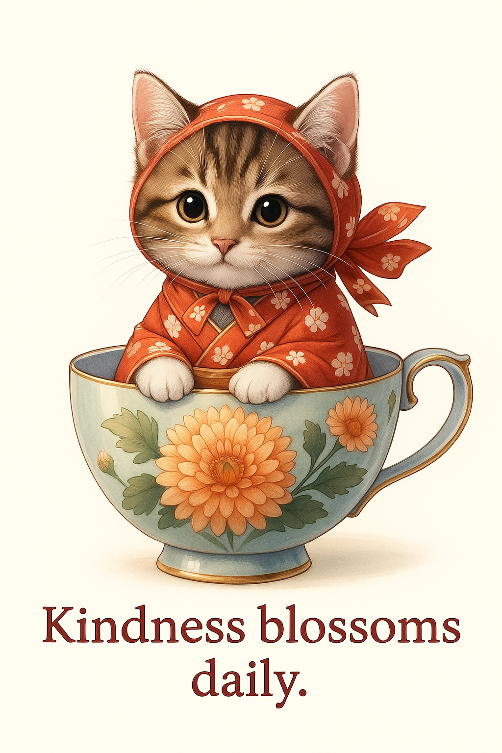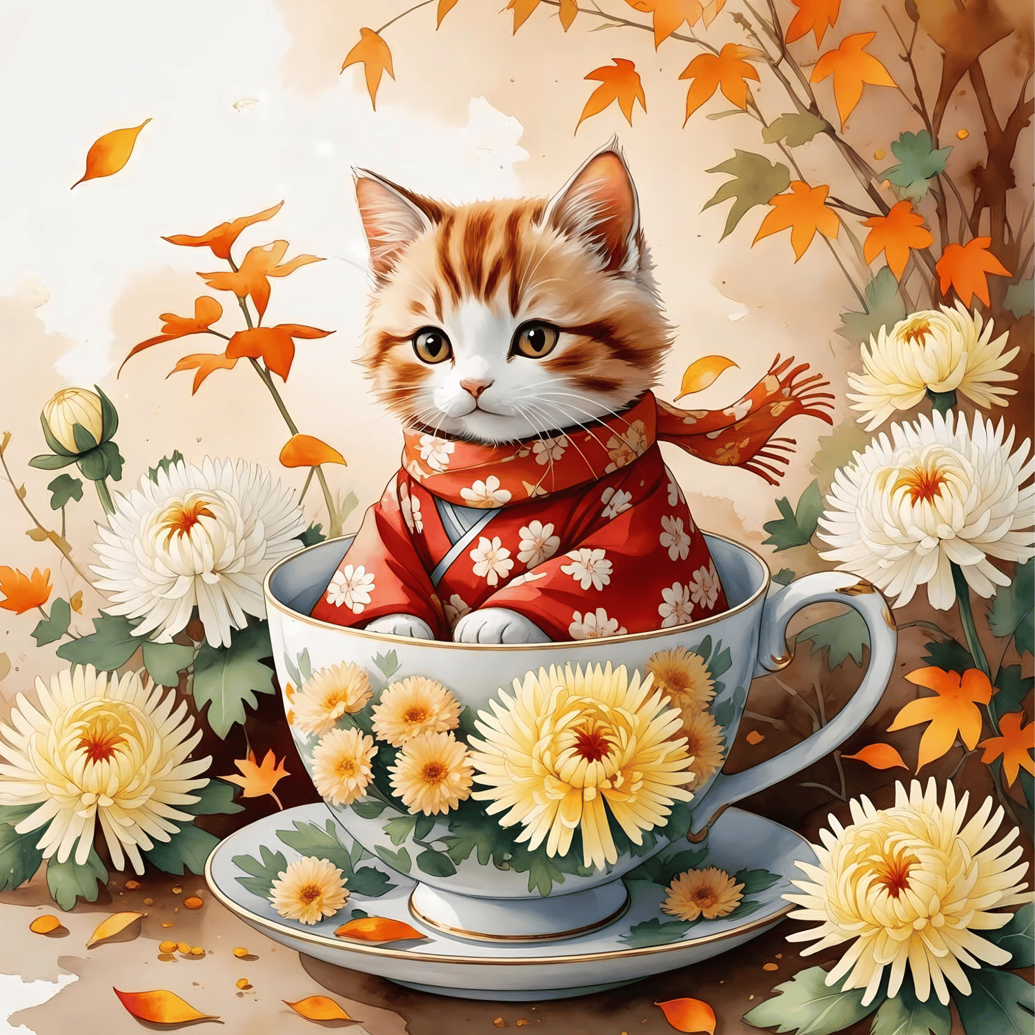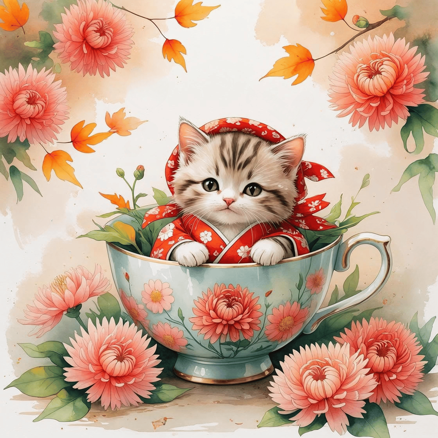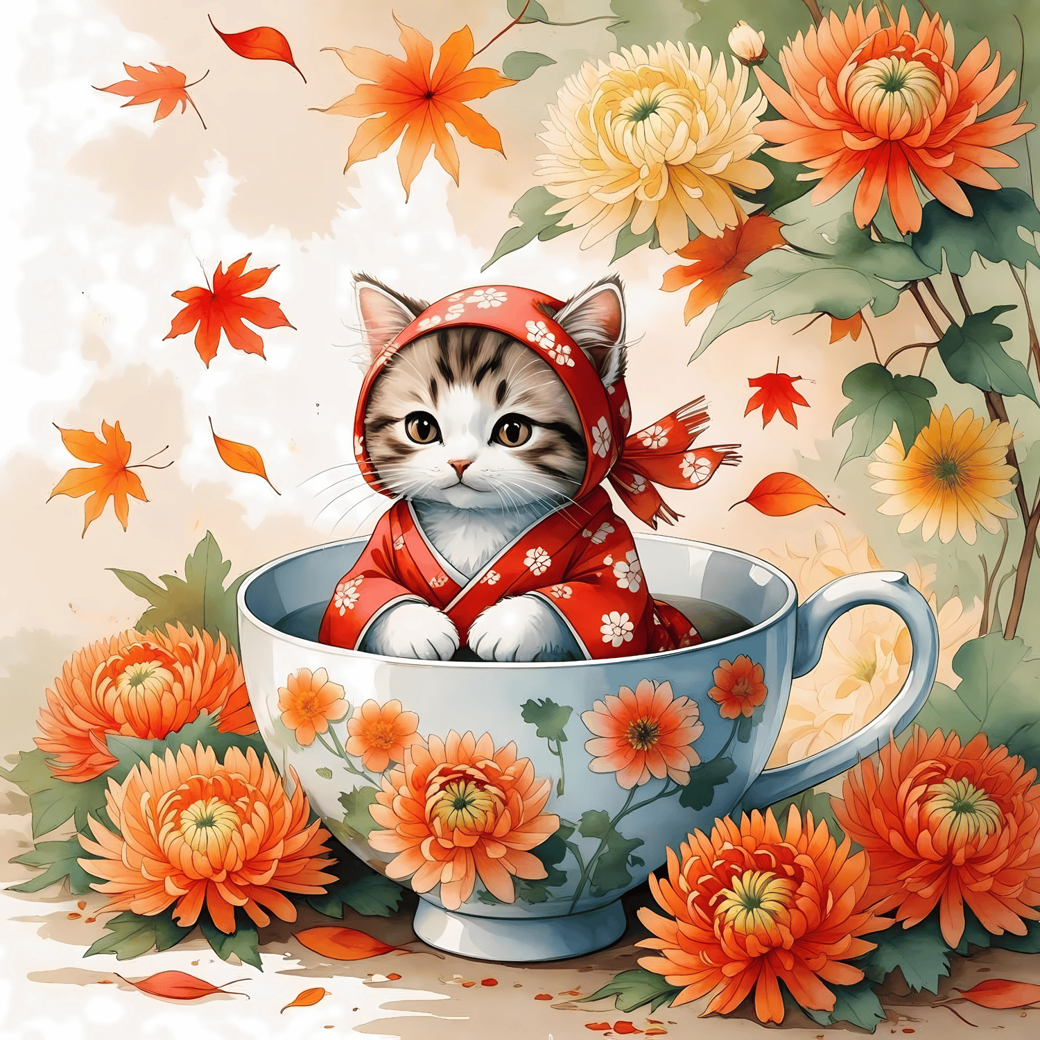Celebrate the cozy beauty of November with this heartwarming digital artwork featuring an adorable kitten dressed in a red floral kimono, snuggled inside a porcelain teacup adorned with blooming chrysanthemums. Symbolizing loyalty, longevity, and the gentle spirit of autumn, this charming design captures the peaceful essence of the season.