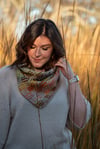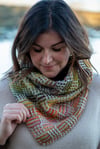 Grid Gambit is a cowl worked flat beginning at one corner, shaped with increases and decreases, and seamed after blocking. The cowl features an allover mosaic pattern, built-in I-Cord edges and an I-Cord bind off.