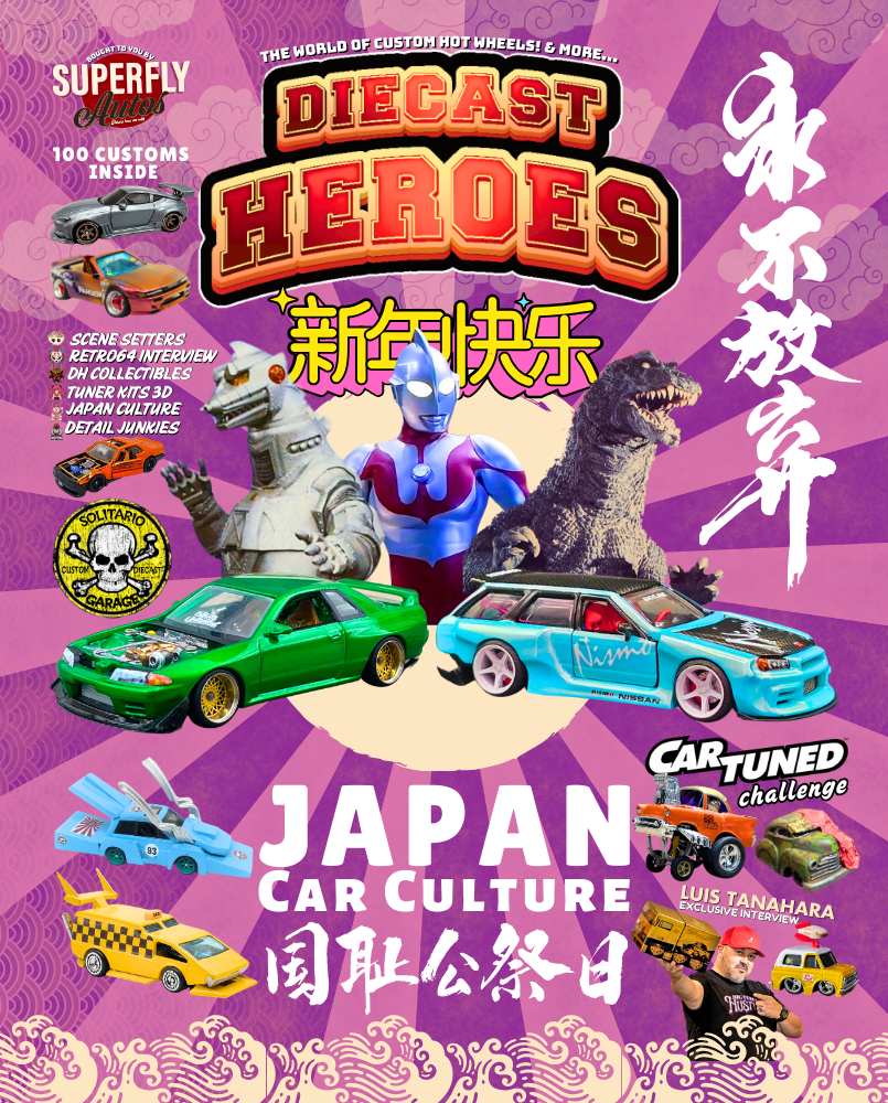 Welcome to volume 17 of Diecast Heroes Magazine, dedicated to the Japan Car Culture! This magazines themed challenge was to build a custom diecast in the style of what you would see on the streets of Tokyo Japan. With over 30 entries from all over the world, plus our first Cartuned Diecast challenge with over 13 entries and the Solitario Garage competition, this issue has 100 custom diecasts! Plus much more...