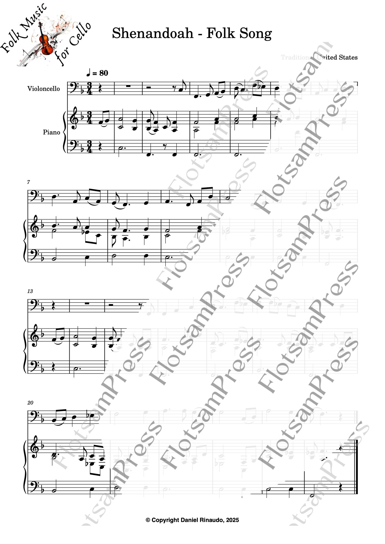 This arrangement of Shenandoah is written for beginner to lower-intermediate cello players, with a simple and supportive piano accompaniment. Perfect for church services, lessons, or home practice.