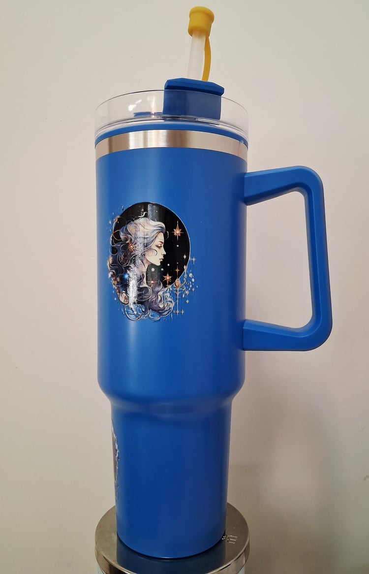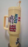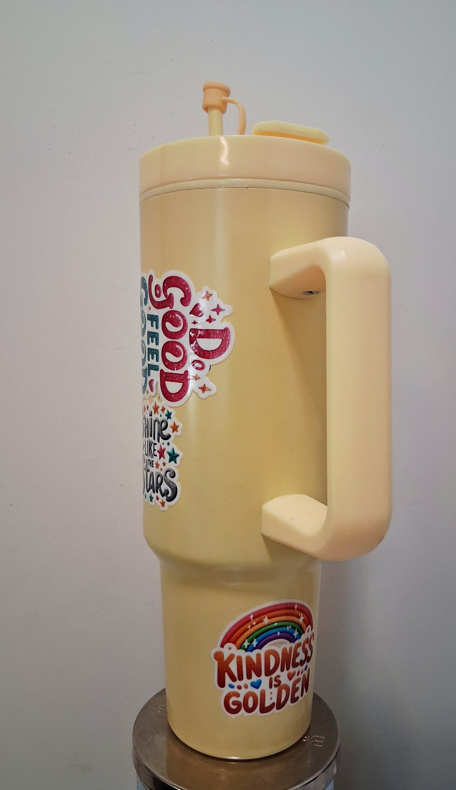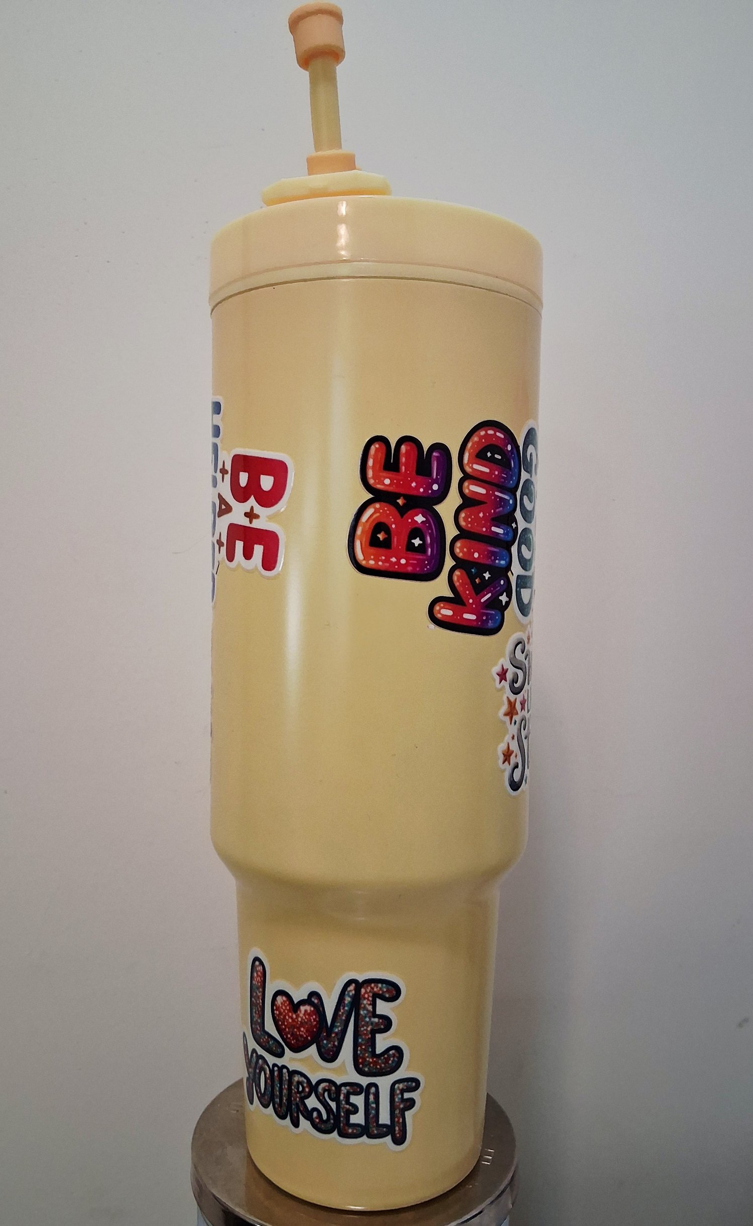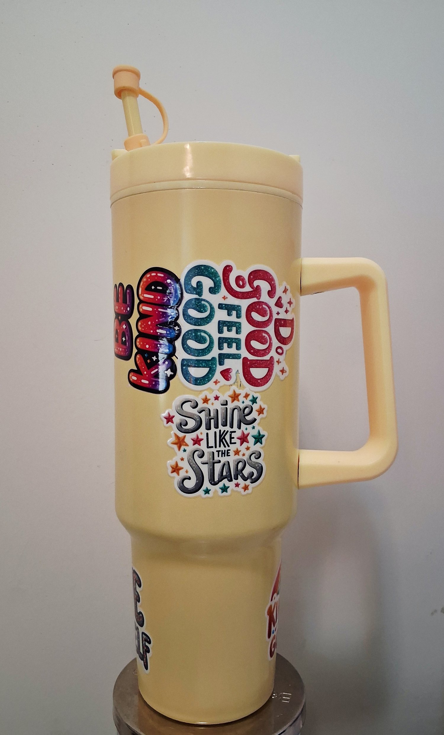 Bright yellow 40z tumbler with positive words to help whoever reads it!