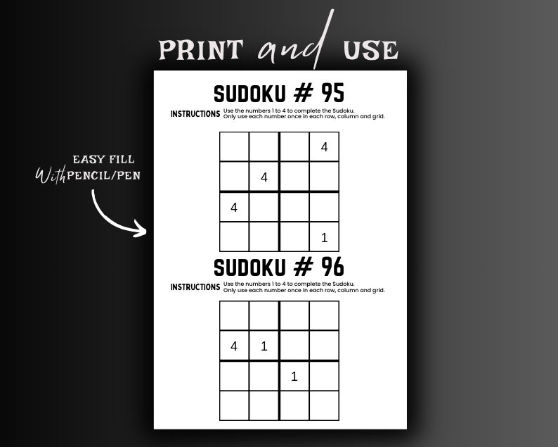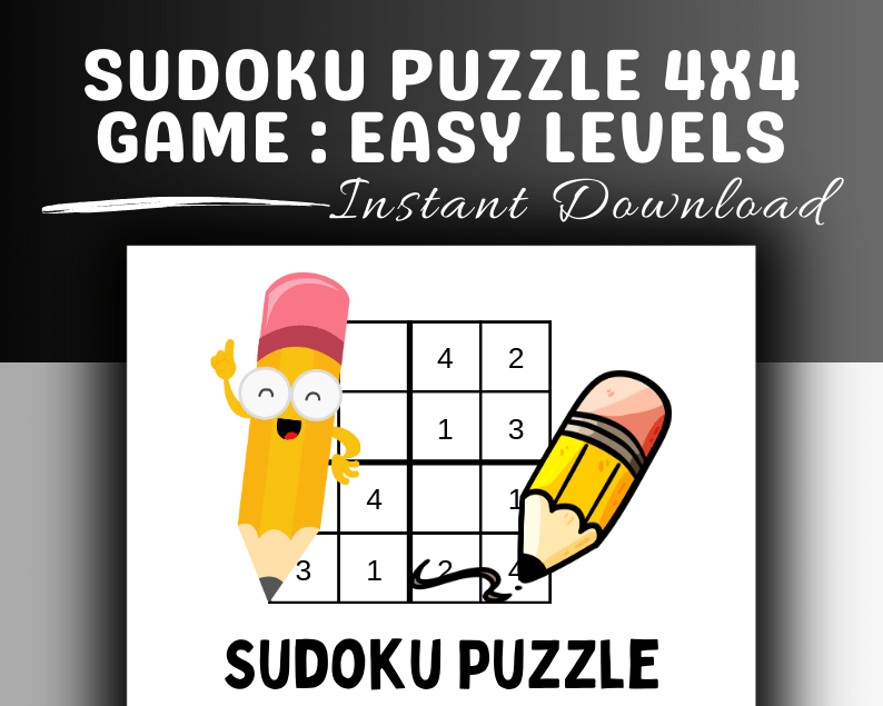 Challenge your brain with this 4x4 Sudoku puzzle, designed for those seeking a light yet stimulating puzzle experience. Ideal for beginners or anyone looking for a quick mental workout, these easy-level puzzles are perfect for sharpening problem-solving skills and enhancing concentration. The game is fully printable and comes with a solution guide for every puzzle to ensure that you can track your progress. Whether you’re on the go or at home, enjoy Sudoku anytime with instant PDF downloads and printable pages.