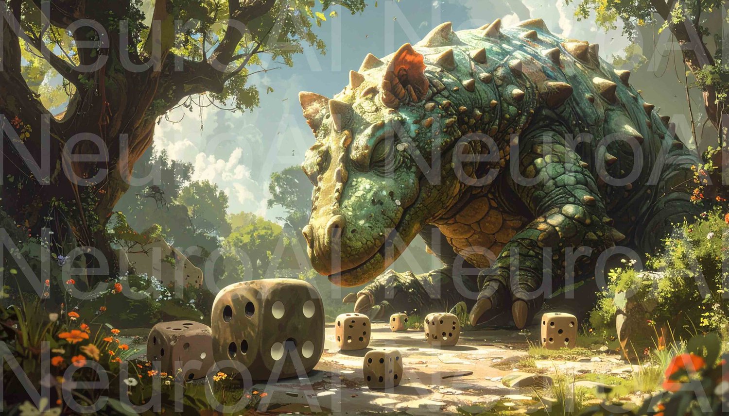 Giant dinosaur contemplates game of chance in lush forest