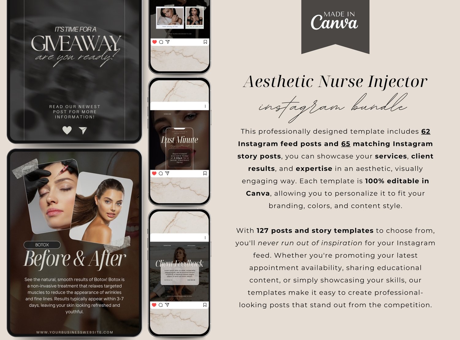 Introducing the ultimate social media bundle for nurse injectors! This professionally designed digital download includes 62 beautifully designed Instagram feed posts and 65 matching story templates, designed to effortlessly enhance your online presence. These posts are 100% unique, designed by us.