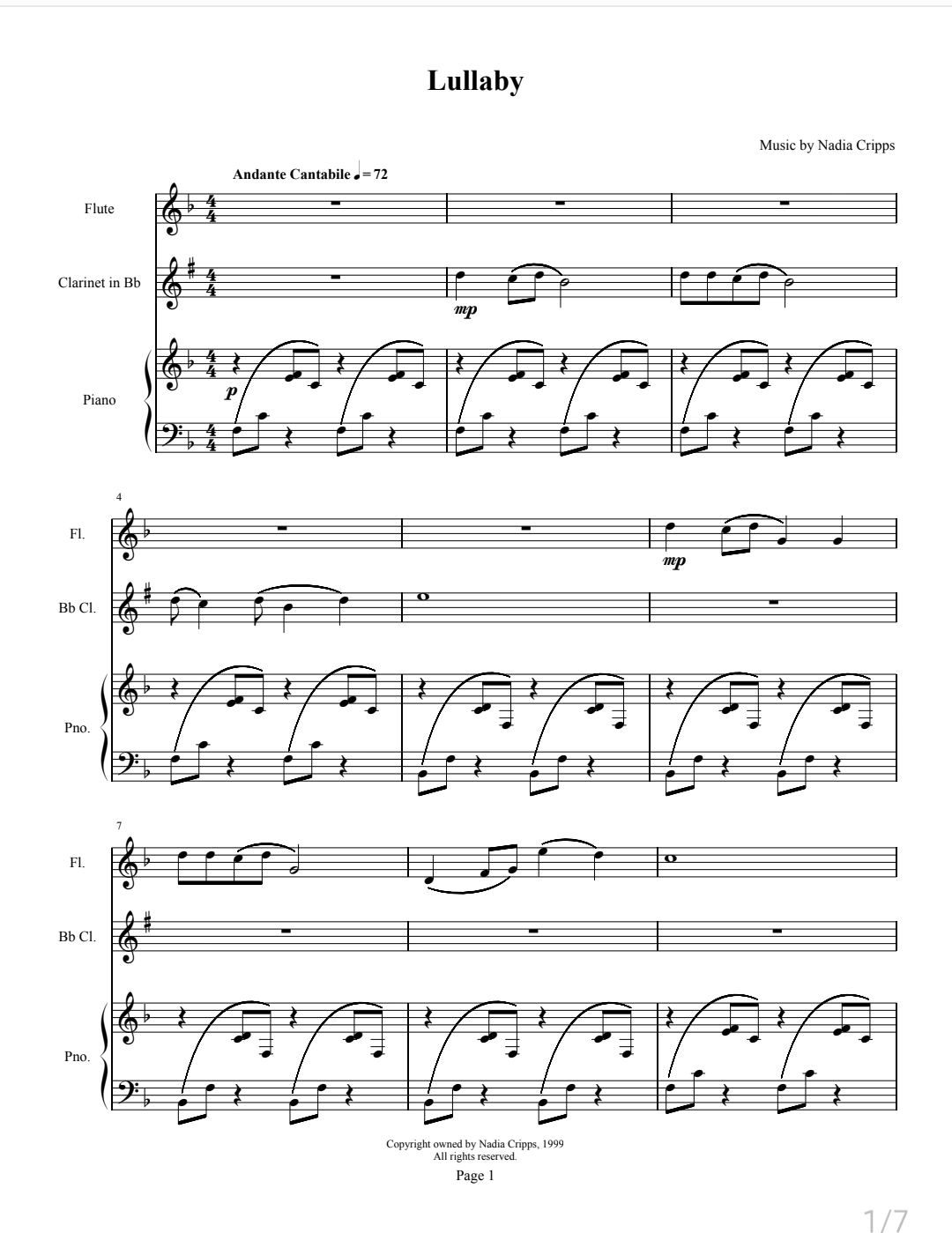 Lullaby by Nadia Cripps. Score for flute, clarinet and piano