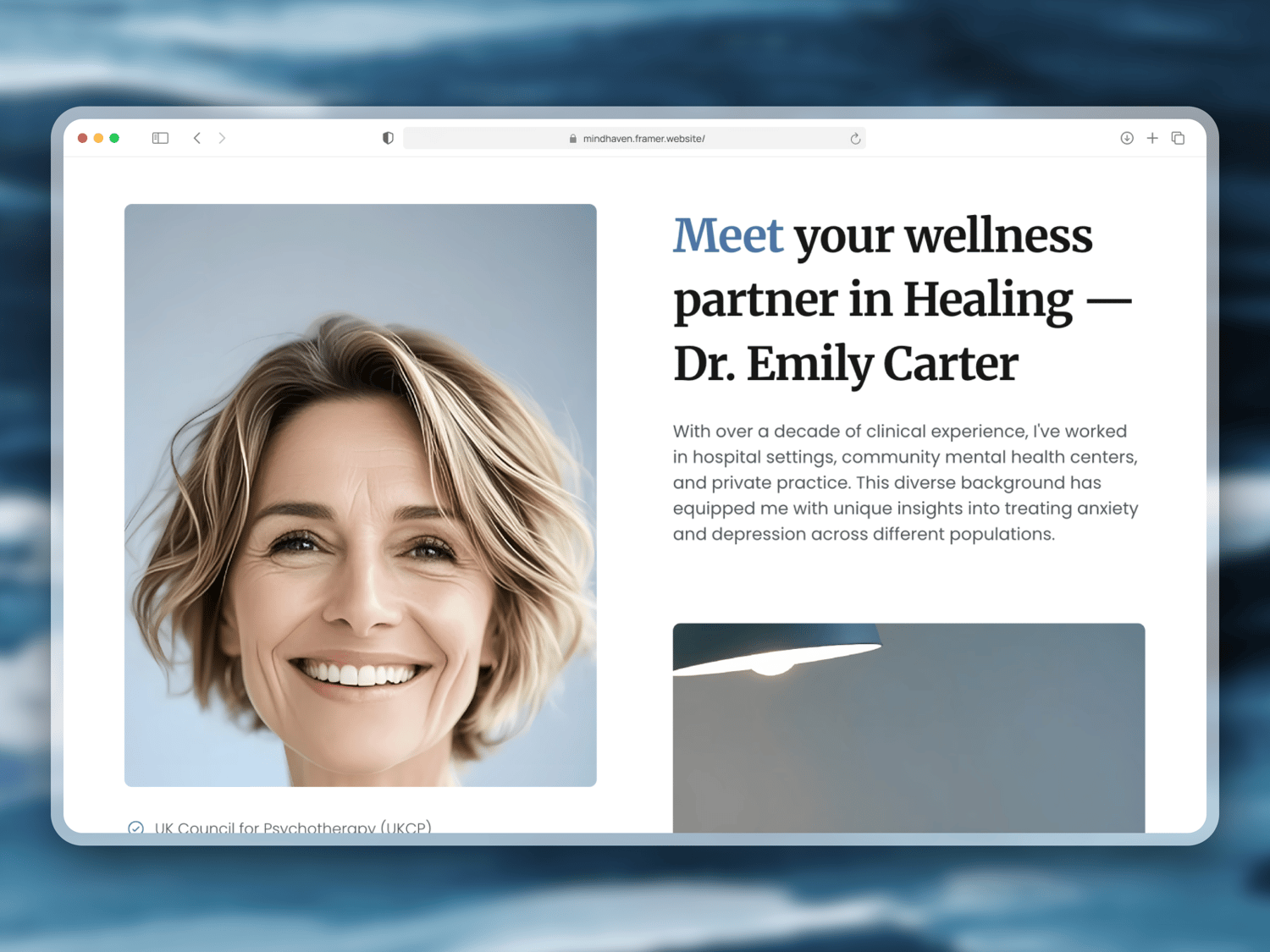 Welcome to MindHaven, your go-to Framer template for creating a professional and impactful psychological consultation website. MindHaven is designed to cater to the needs of psychologists and therapists looking to establish a strong online presence. This template is not just visually appealing; it's a tool that facilitates connection and trust with your clients.