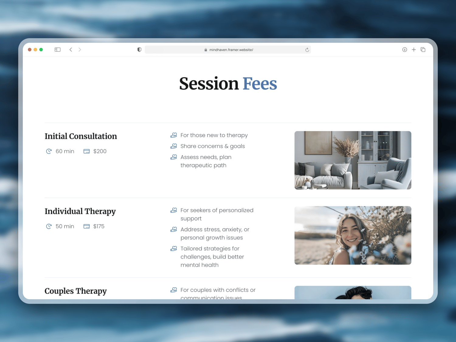 MindHaven features an intuitive layout that makes it easy for visitors to learn about your services, your approach to therapy, and how to get in touch for appointments. The design is clean and modern, ensuring that your site looks professional and is easy to navigate on any device.