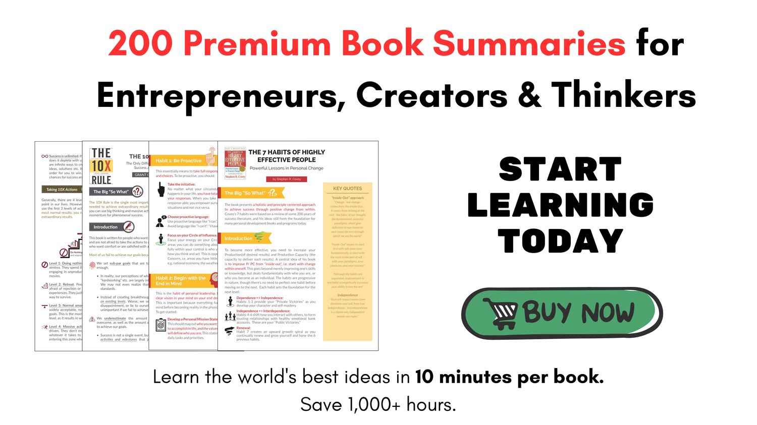 - ✔ Each summary includes: key ideas, quotes, lessons, and action steps